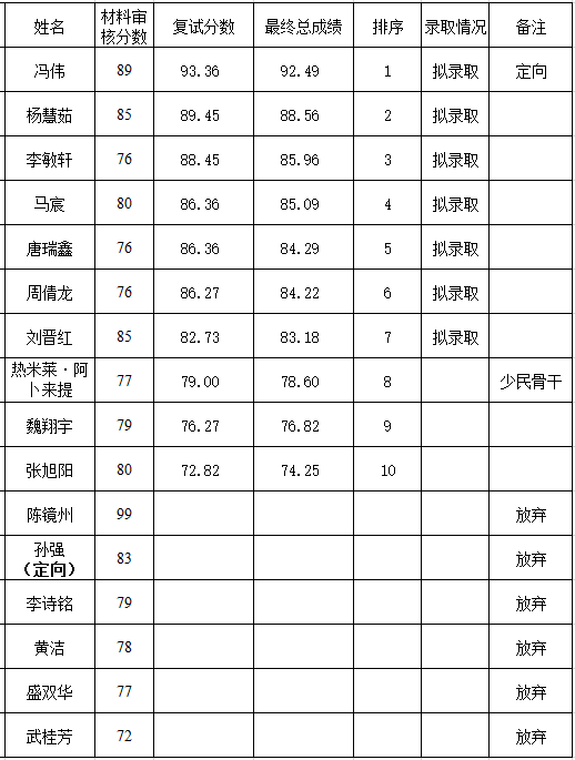 考核结果按总成绩排序,顺位录取。考生总成绩计算方法(满分100分):材料审核成绩*0.2+专业综合面试成绩*0.8。