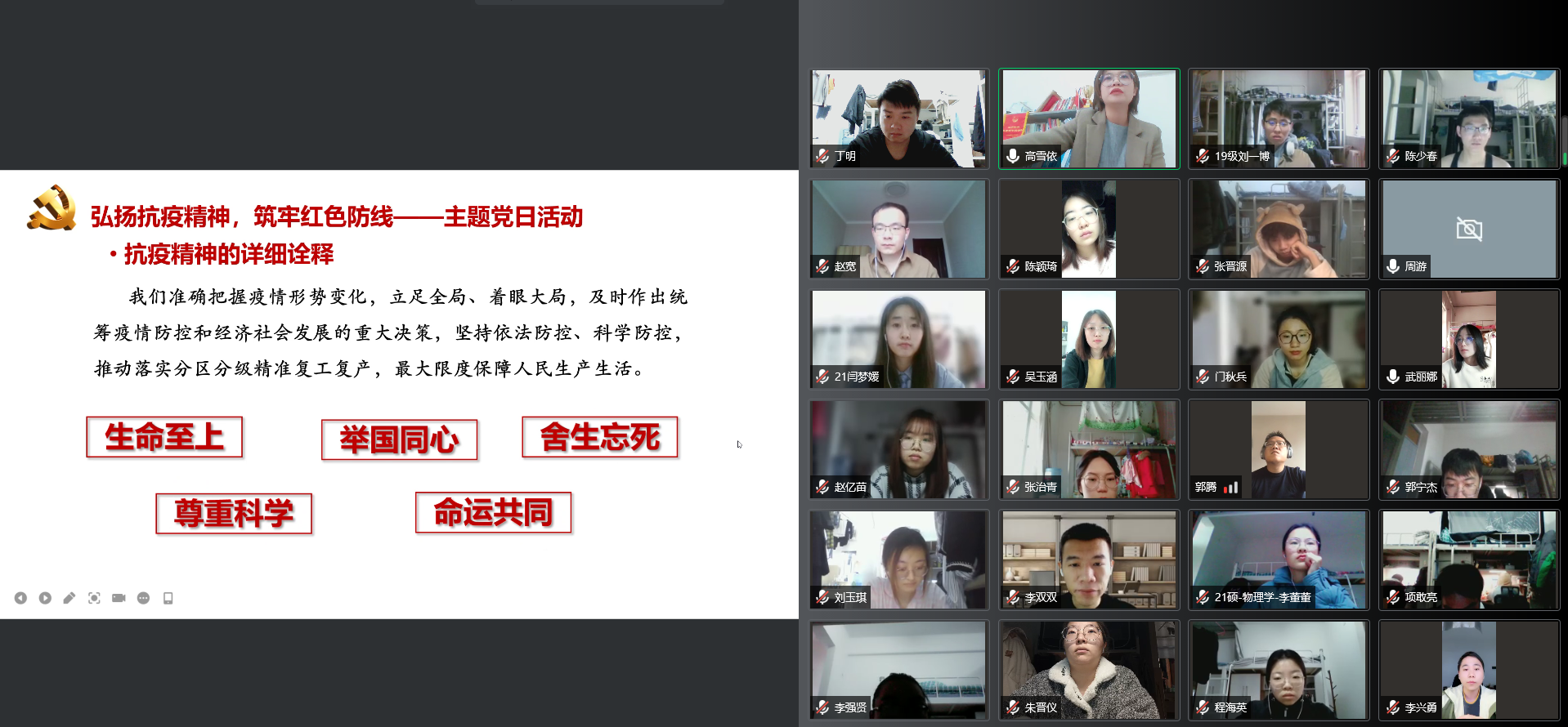 为贯彻落实学校防疫有关安排部署,发挥好党员先锋作用,引导研究生党员在疫情防控工作中厚植爱国主义情怀、强化责任担当意识、彰显拼搏奋斗精神、坚定战疫必胜信心,1月5日下午,366net必赢官网研究生先锋党支部55名党员齐聚云端,举办“弘扬抗疫精神,筑牢‘红色防线’”主题党日活动,活动由支部书记高雪依主持。
