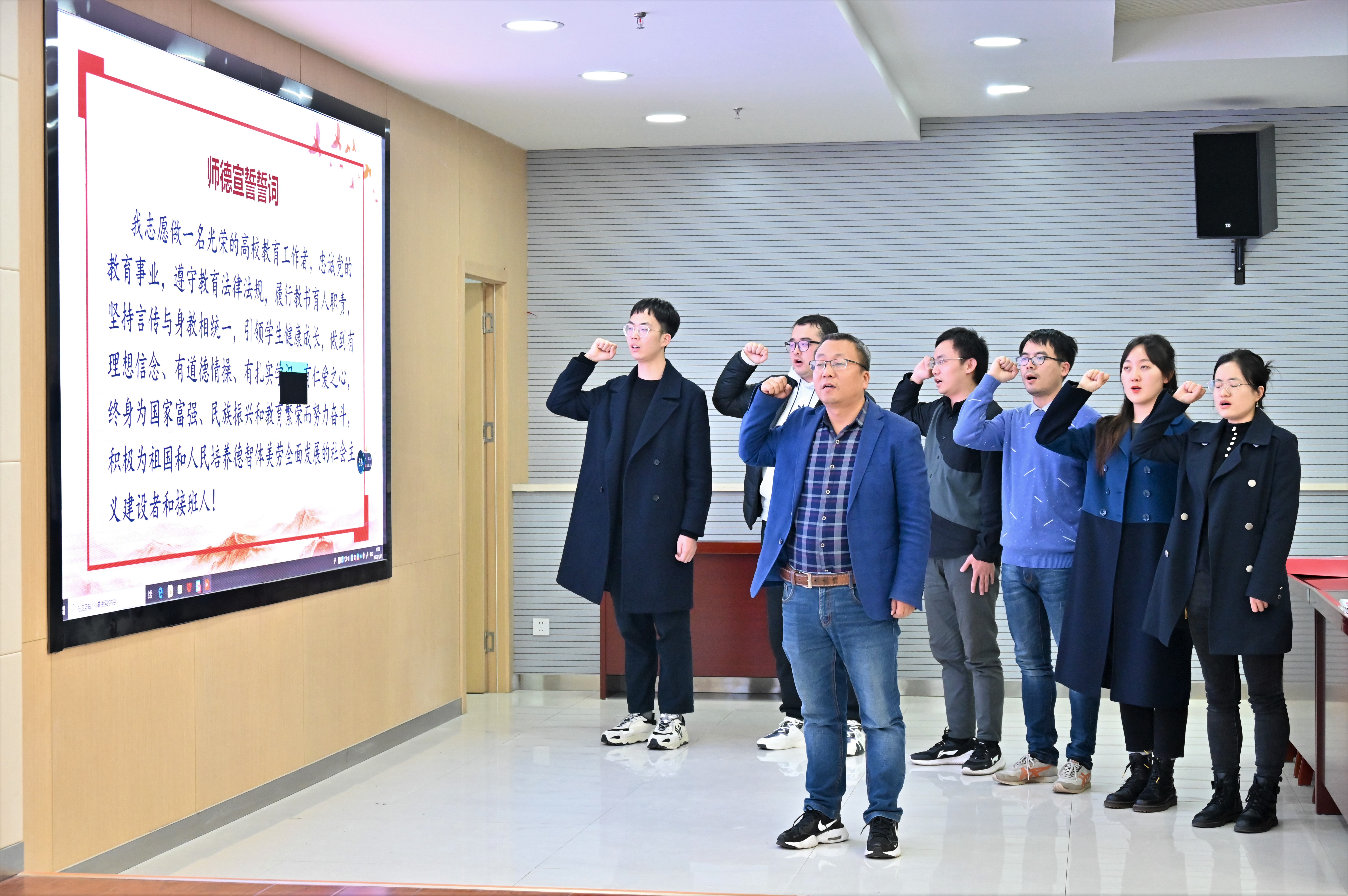 随后,6名新入职老师在各自团队的党政负责人见证下签订师德承诺书,并在执行院长杨战营带领下进行了庄严而神圣的师德宣誓;会议传达学习了学校《关于认真学习宣传党的二十大精神扎实推进教风建设专项行动的通知》,对学院贯彻落实工作进行了安排部署。全体与会人员合唱校歌,圆梦西大,在歌声中本次专题研讨会圆满结束。