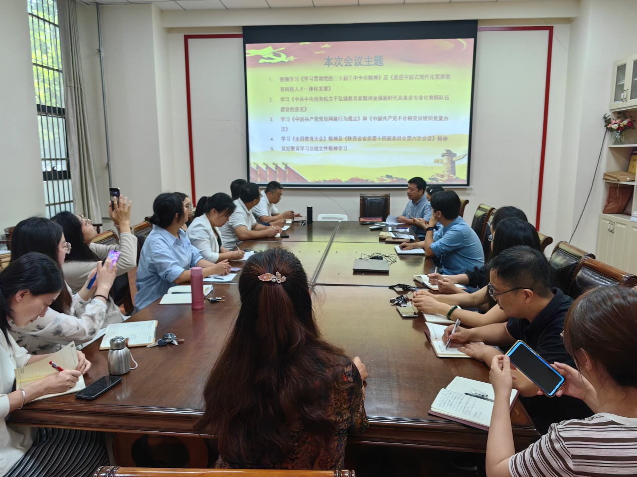 随后,各党支部集体学习了党的二十届三中全会精神及全国教育大会精神,大家纷纷表示,通过本次学习进一步增强了自身的纪律观念和规矩意识,明确了作为一名党员教师的责任和使命。在今后的工作中,将以更高标准严格要求自己,全面贯彻党的教育方针,自觉传承教育家及学科榜样精神,努力成为精通专业知识的“经师”和涵养德行的“人师”,为培养新时代社会主义接班人恪尽职守、努力工作。