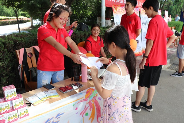 下午,实践队以展板讲解和发放宣传册的方式在当地社区-雅苑小区进行宣讲,让社区的人们了解侯伯宇先生的先进事迹。队员向过往的行人发放宣传册,并介绍侯伯宇先生的感人事迹,宣扬侯伯宇先生的伟大精神。行人仔细阅读宣传册内容,耐心倾听队员讲解,对侯伯宇先生的积极探索、勇攀高峰,潜心育人、甘为人梯,淡泊名利、无私奉献的共产党人崇高的思想境界和价值追求表示极高的赞扬,部分家长表示深受感染,并将宣传册带回家给孩子讲解侯伯宇先生事迹。