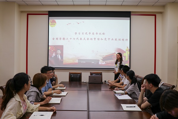 接着,学生会主席团轮值主席史雯珺与大家共同学习习近平总书记给全国学联二十七代表大会的贺信和党中央致辞精神。习近平总书记在贺信中对广大青年寄予殷切期望、提出明确要求,进一步夯实广大青年坚定跟党走、奋进新时代的决心和信念。当前,我们正处在“两个一百年”奋斗目标的历史交汇期,要实现中华民族伟大复兴中国梦,就要牢记习近平总书记致大会的贺信精神,为青年创造干事的平台,帮助青年练就过硬本领。