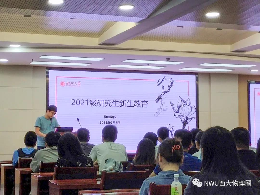 杨军良副书记对全体2021级研究生表示欢迎祝贺,他简要介绍了物理学科的历史、现状和前景,并用详实的数据分析了学院近年来硕博士生招生、学业、毕业、就业等情况,希望所有新生走下网络、走出宿舍、走进操场、走进课题组、走进实验室、走进图书馆,迅速适应新学位教育阶段的新要求,在新征程上取得更好的新成就。