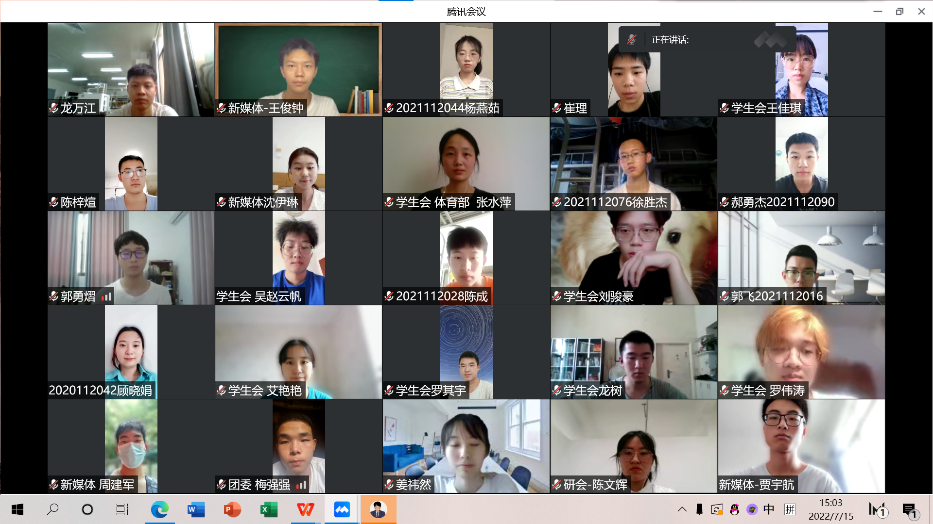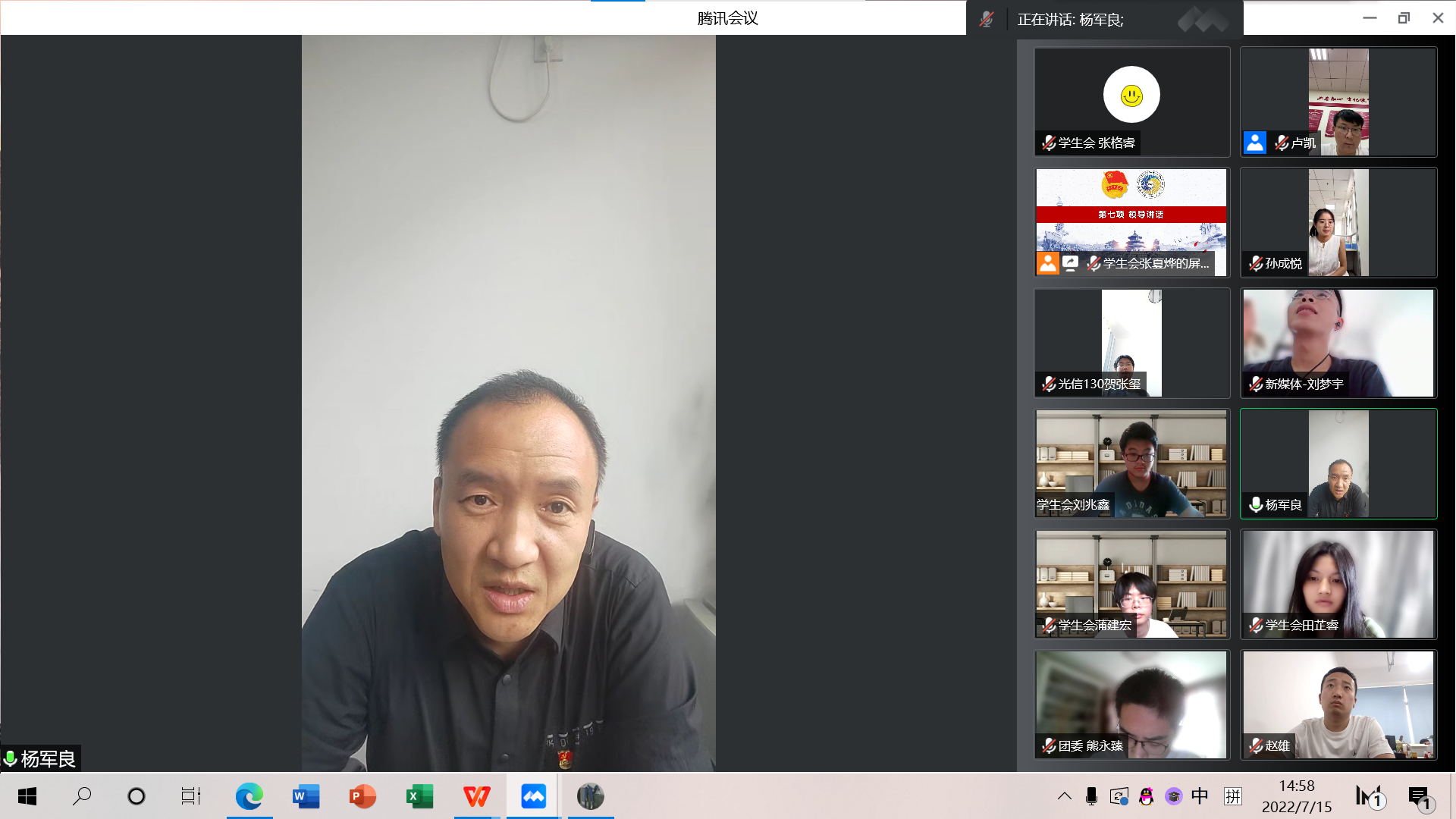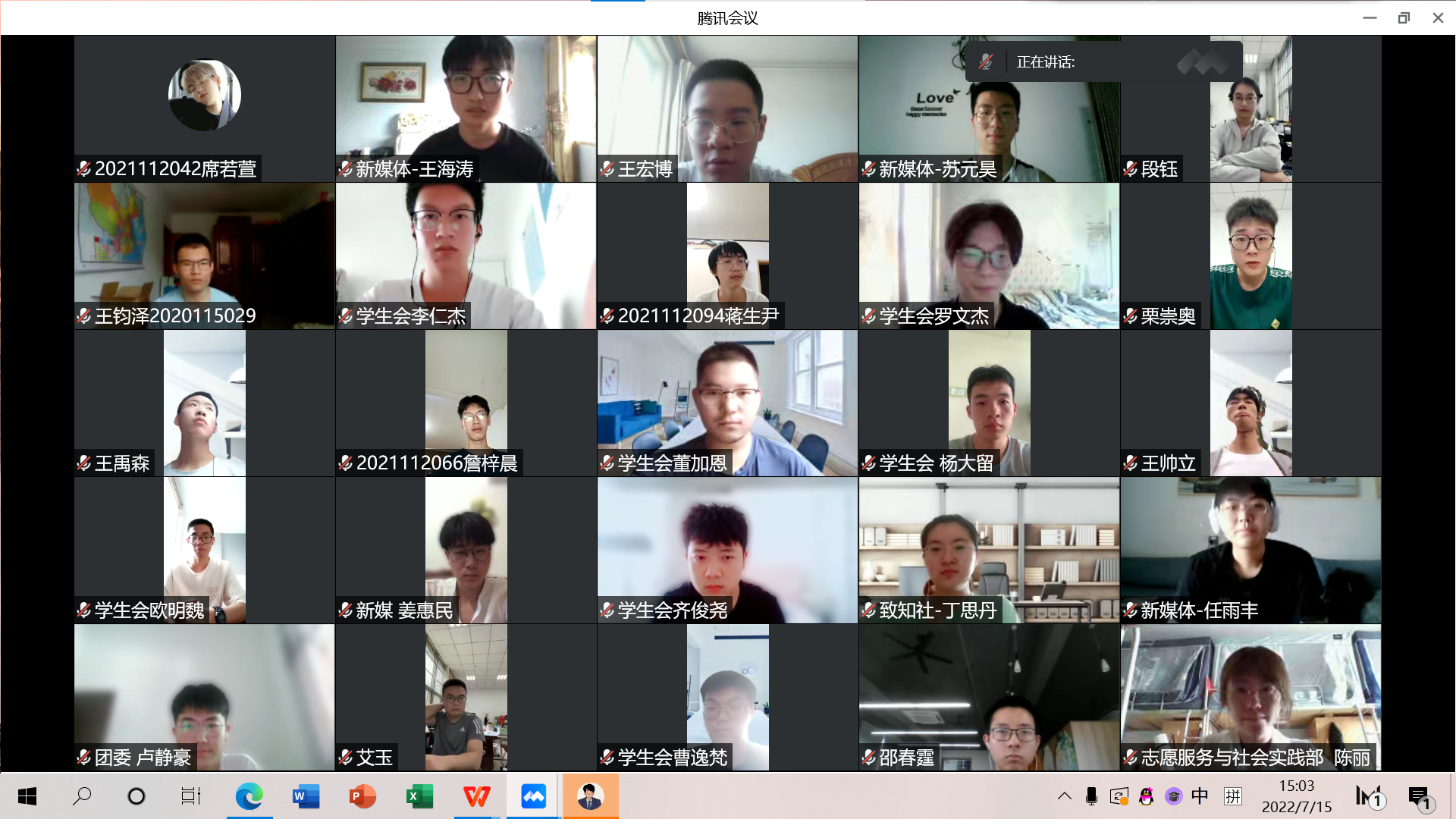 7月15日下午,366net必赢官网团委举办第四期“青年骨干训练营”结业典礼暨366net必赢官网团学组织中期换届大会在线上隆重举行。学院党委副书记杨军良、院团委书记高雪依、院团委副书记段钰、专职团干艾玉、团学组织主要负责人及全体青马学员参加了本次活动。本次活动由学院团委副书记卢凯老师主持。