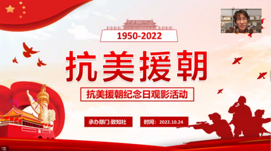 2022年10月25日是抗美援朝72周年纪念日,为响应党的二十大报告中提出的“着力培养担当民族复兴大任的时代新人”伟大号召,进一步弘扬爱国主义精神,缅怀英雄丰功伟绩,366net必赢官网“致知社——侯伯宇先进事迹讲解队”于纪念日当晚,组织开展“赓续红色血脉,争做时代新人”主题观影活动,致知社全体成员及部分学生共200余人线上参加。