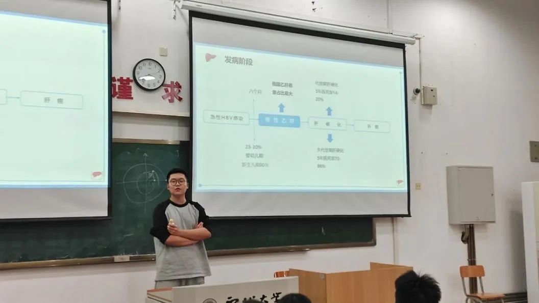 赵博学长给大家普及了乙肝的预防知识。他指出,乙型肝炎是由HBV侵入人体,使得细胞免疫应答,最终导致肝细胞病变损伤而引起的。虽然中国乙肝感染率及死亡率均居高不下,但还是可以进行防治。习惯上要洁身自爱,注意私人用品的保护,切记喝酒伤肝、药物伤肝、抽烟伤肝,尤其孕妇要注意母婴阻断,牢记这些措施,乙肝将不会有可乘之机。