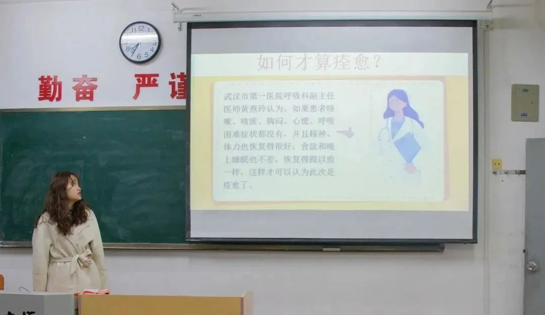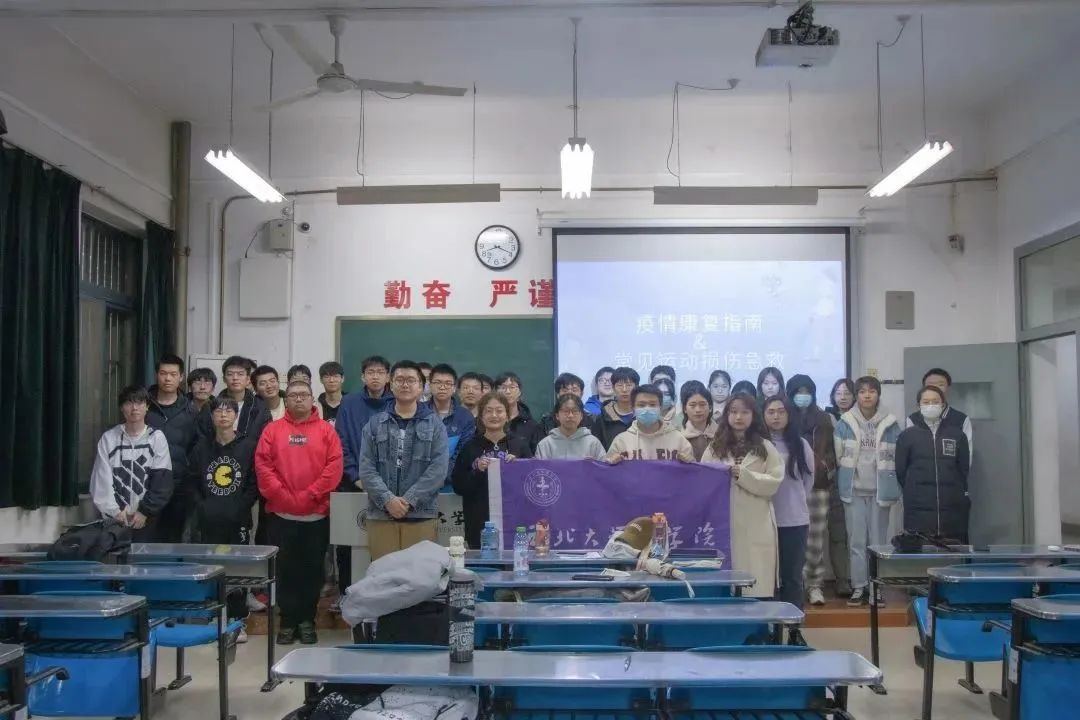 本次活动我们邀请到了医学院的邱玉洁、彭乐儿、马琪、杜娅、杨佳琳、户卓越、赵博等几位同学,他们首先为我们介绍了“阳康”后短期存在的症状,接着重点讲解了康复后开展运动的注意事项,最后对常见的运动损伤处理等医疗救护技能作了详细讲解。