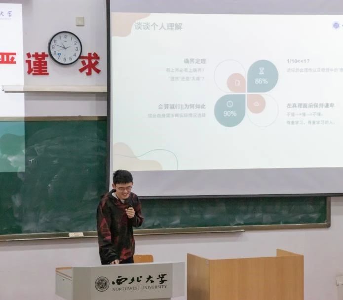 2022级物理学类5班李语哲同学讲述了他的学习心得。在学习态度上,他提出要戒骄戒躁,脚踏实地,切忌妄自菲薄、骄傲自大;在心态管理上,要学会劳逸结合,追求学习效率;在学习方法上,他讲了数学在物理学习中的重要性并介绍了学习数学的方法;在学习风气上,他认为物理学习需要交流,可以通过建立学习小组来巩固知识基础。