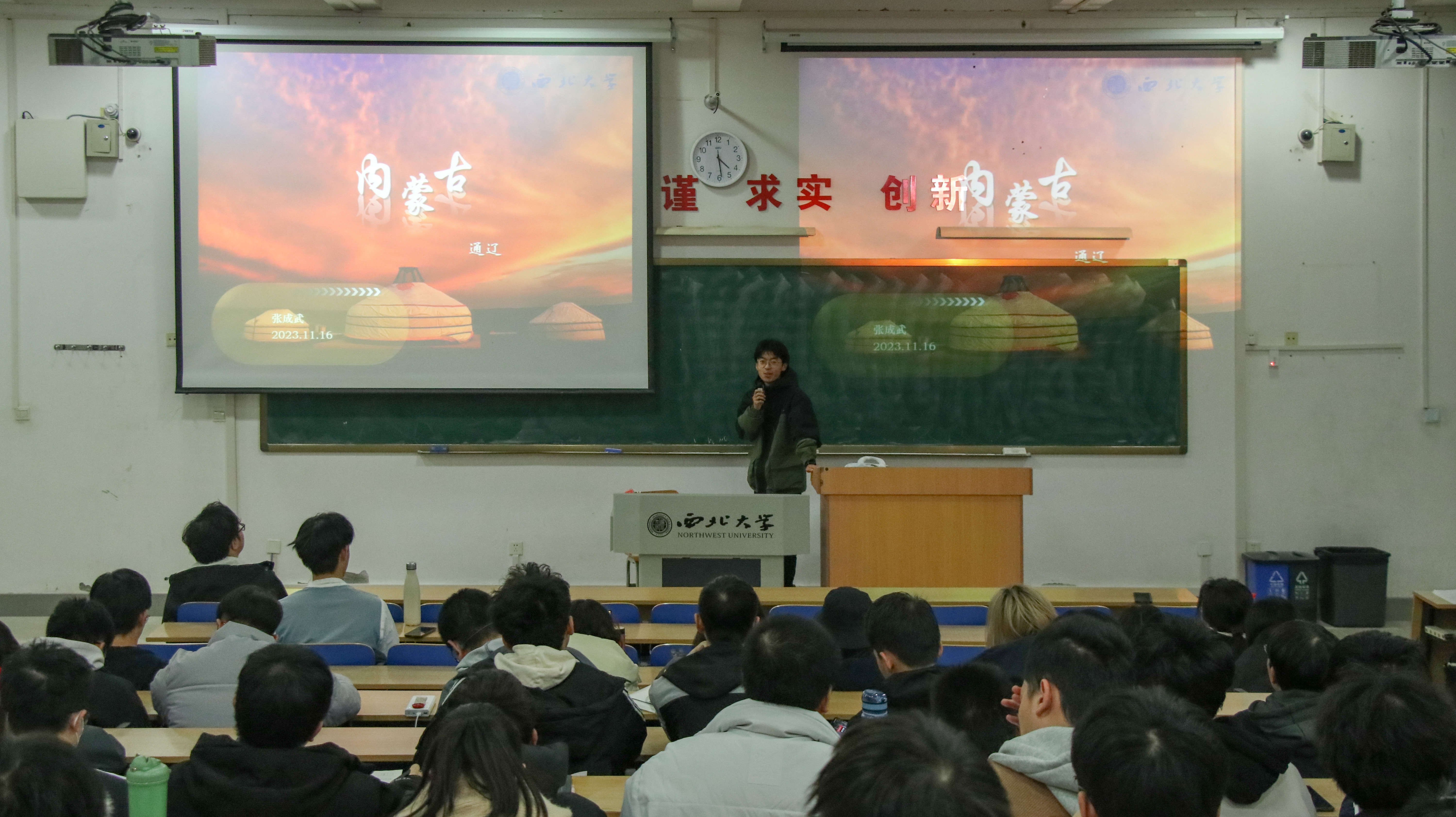 来自蒙古族的张成武同学通过介绍自己的家乡通辽来讲述自己心中的蒙古族。他从内蒙古高考志愿填报入手,讲述了自己报志愿的趣事。他向大家介绍了珠日河草原、银沙湾、可汗山等极具当地特色的自然风景。接着,通过一段视频他带大家了解了内蒙特色的饮食和当地的安代舞和马头琴,优美的舞蹈伴随着悠扬的音乐,让人心旷神怡。