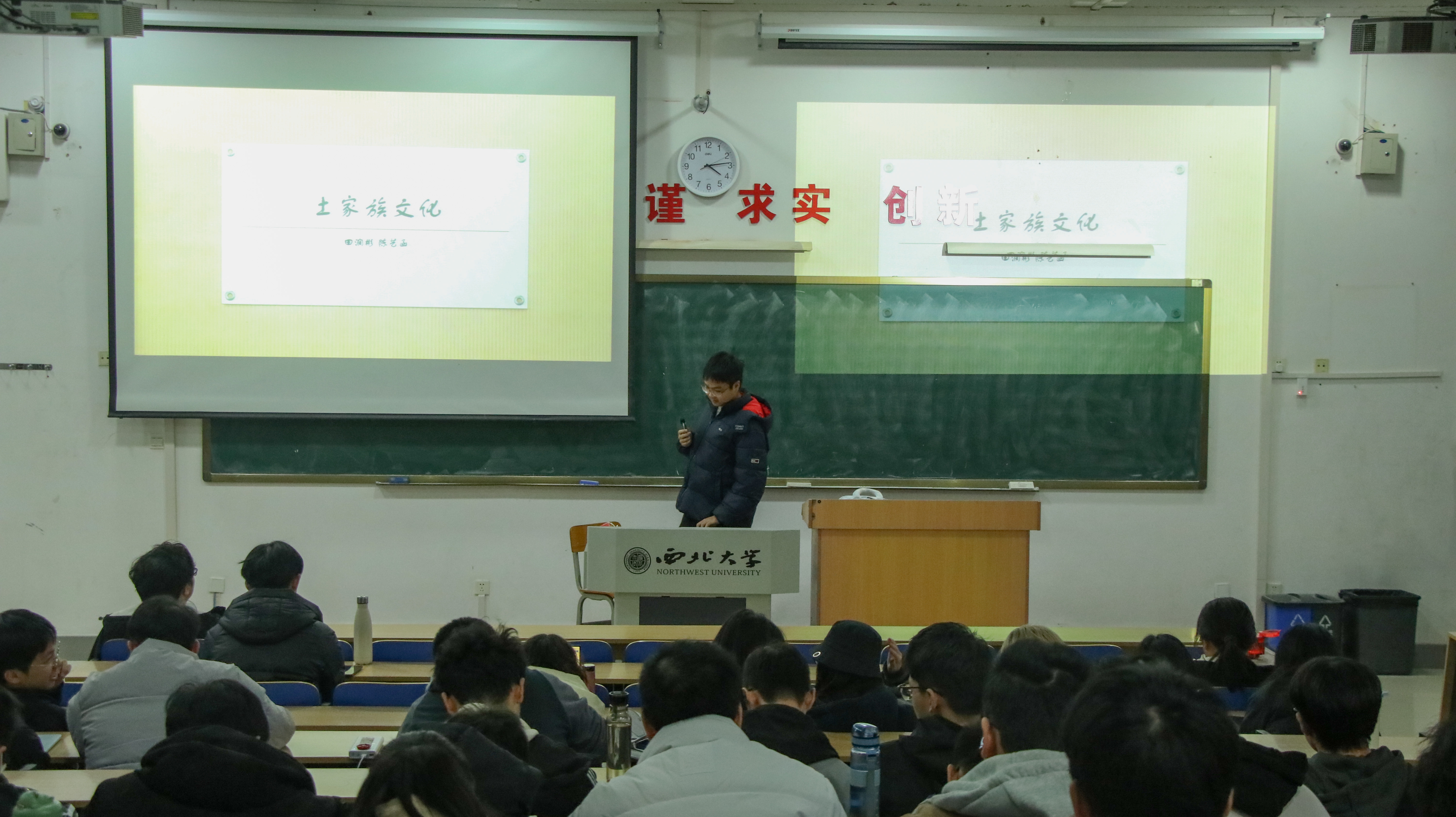 来自土家族的田润彬同学介绍了土家族的历史与风俗习惯等。他首先介绍了土家族浓厚的历史背景和民族服饰的样式以及服饰特色。接着,他介绍了依据自然地理环境,择险而居,依山筑寨的居住风俗和土家族的特色美食。最后,他向我们展示了当地的特色舞蹈——摆手舞。通过对土家族历史与风俗习惯等的介绍,大家对土家族有了更深入的认识。