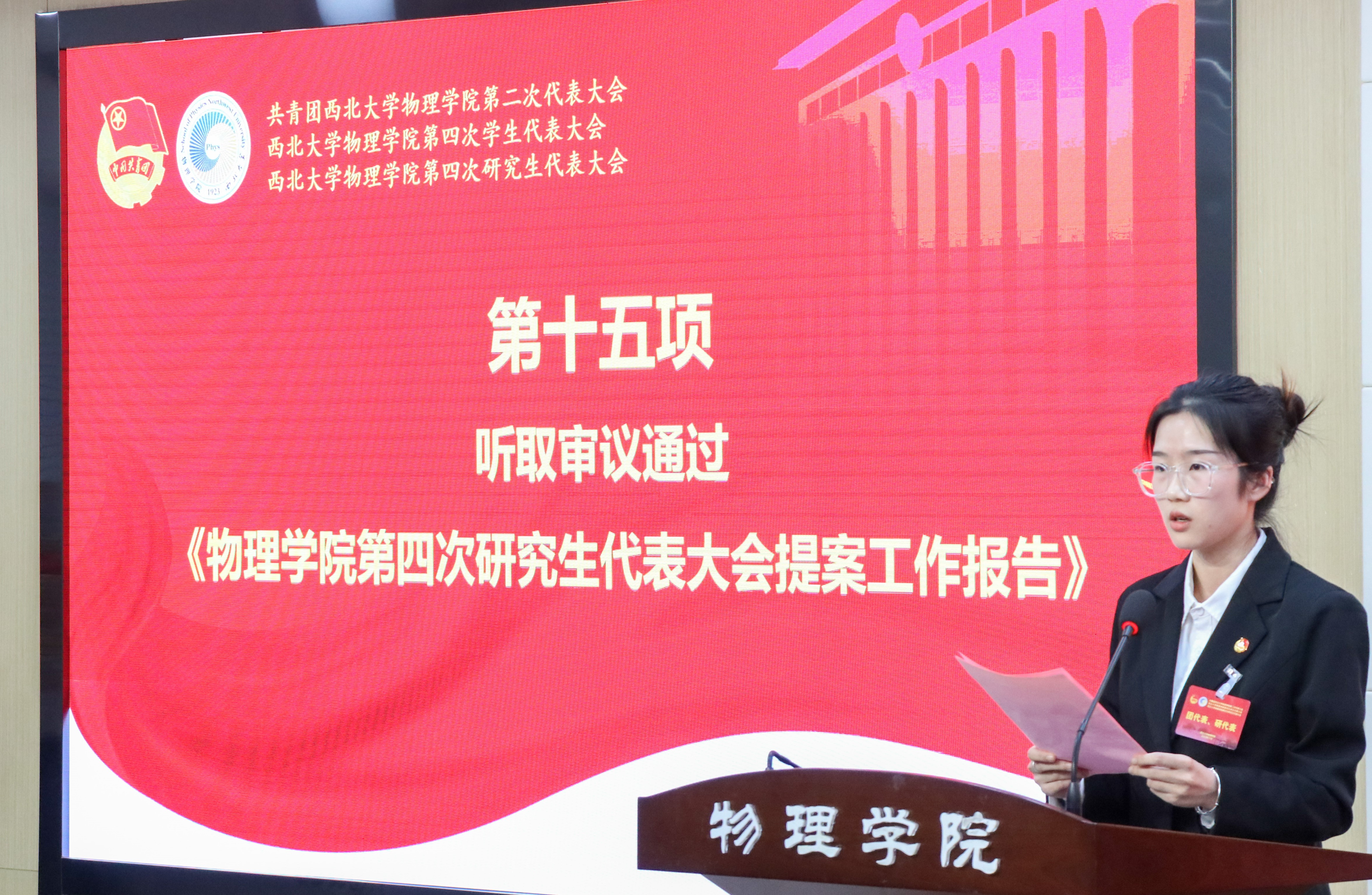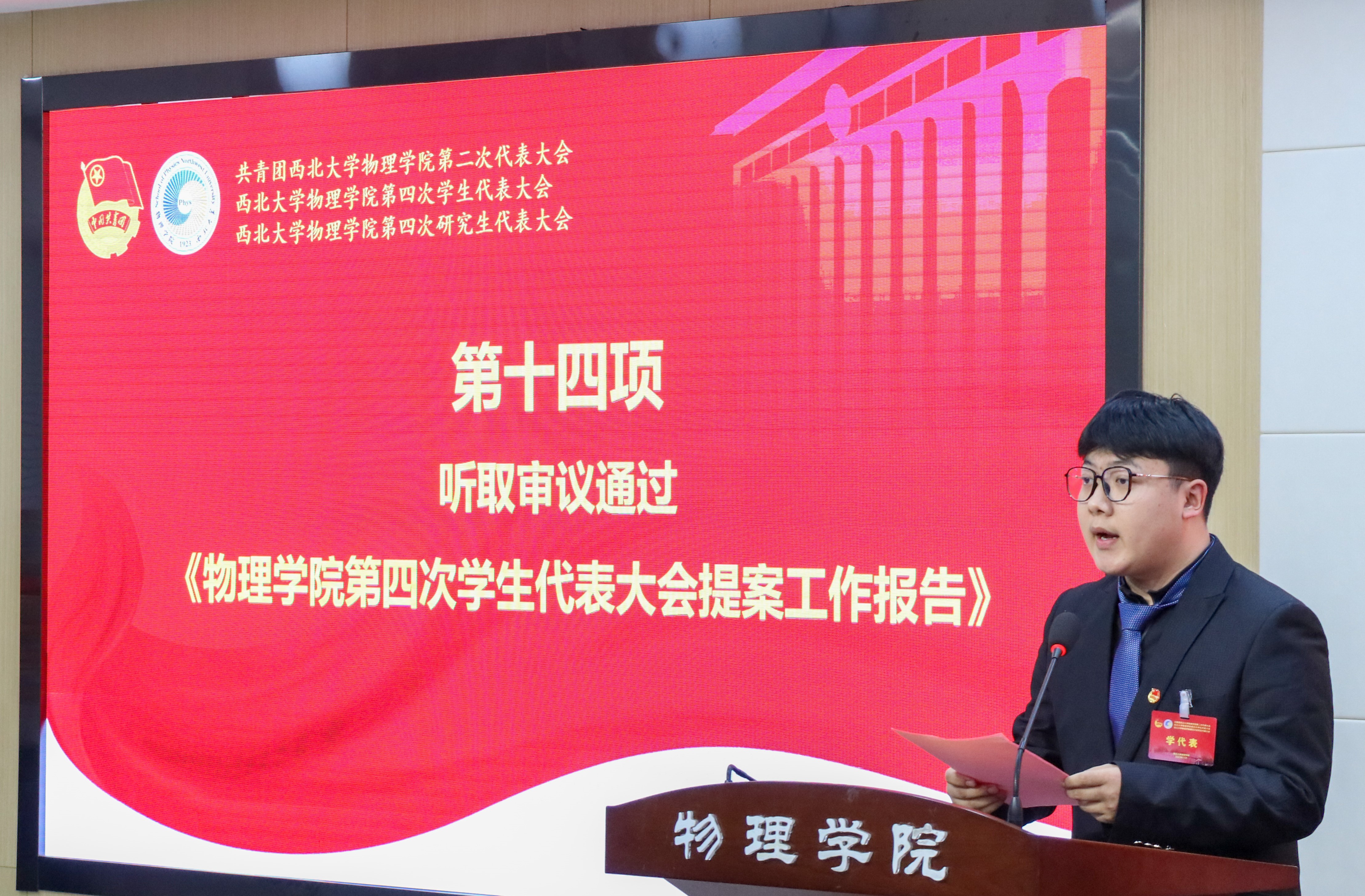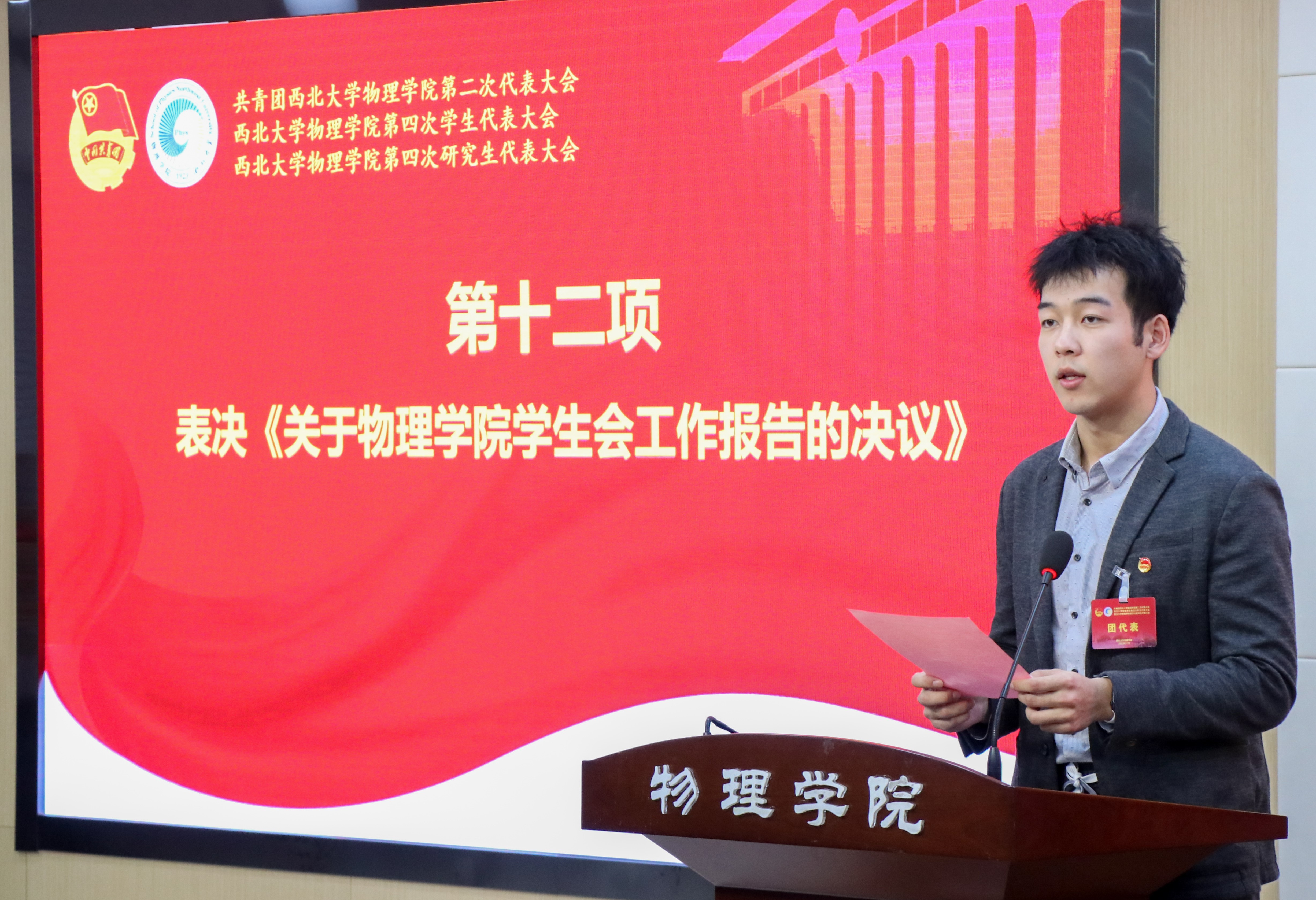 366net必赢官网团委书记卢凯老师代表366net必赢官网委员会作题为《坚定不移跟党走、牢记嘱托当先锋,团结带领全院青年传承百年荣光,续写时代华章,在学院高质量发展新征程奋勇争先》的工作报告;学生代表韩丰圣受366net必赢官网学生分会主席团委托,作题为《踔厉奋发,勇毅前行,奋力谱写物理学子的青春华章》的工作报告;366net必赢官网研究生代表王丹受366net必赢官网研究生会委托,作题为《敢为人先,秉承物院精神;挺膺向前,不负青春韶华》的工作报告。