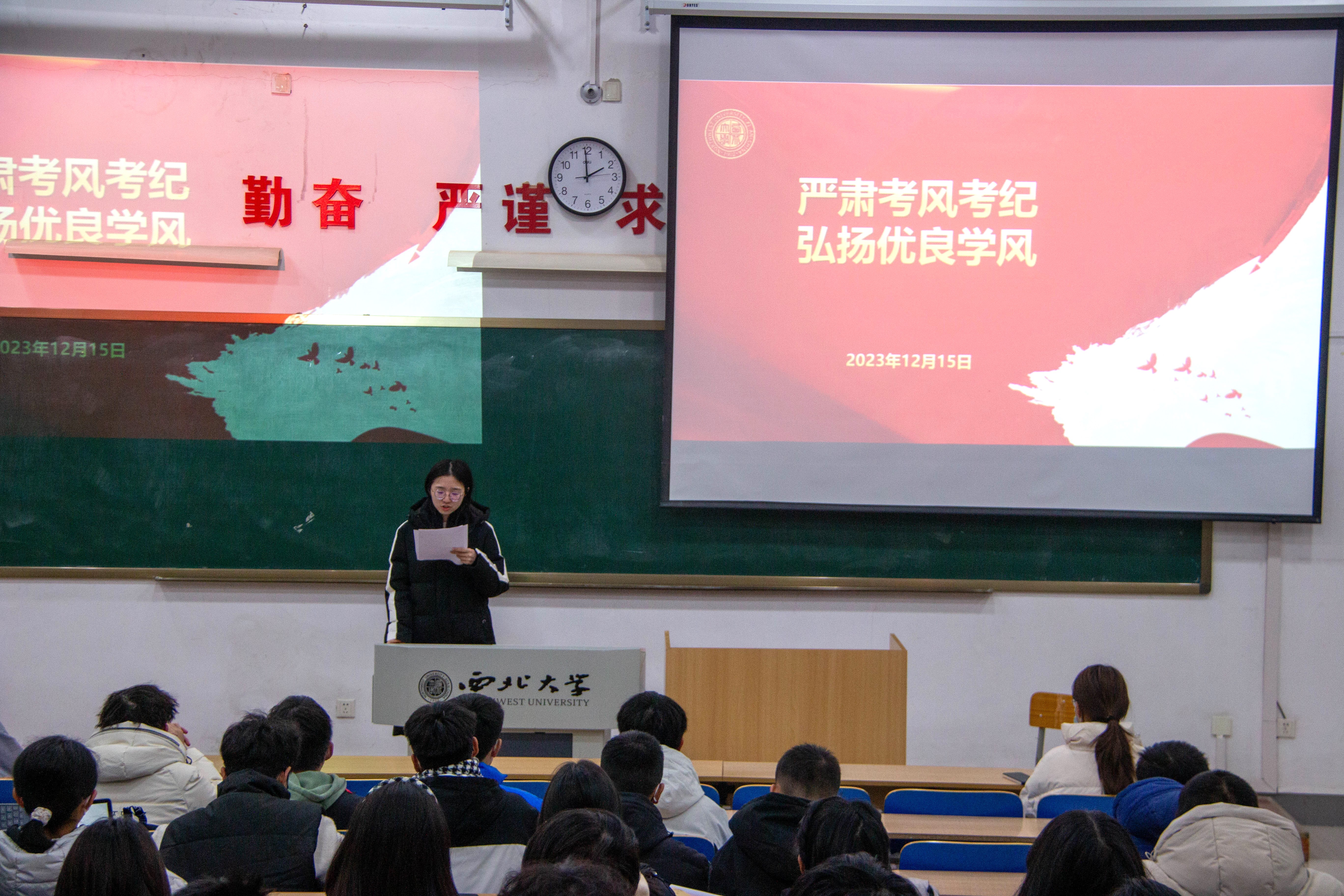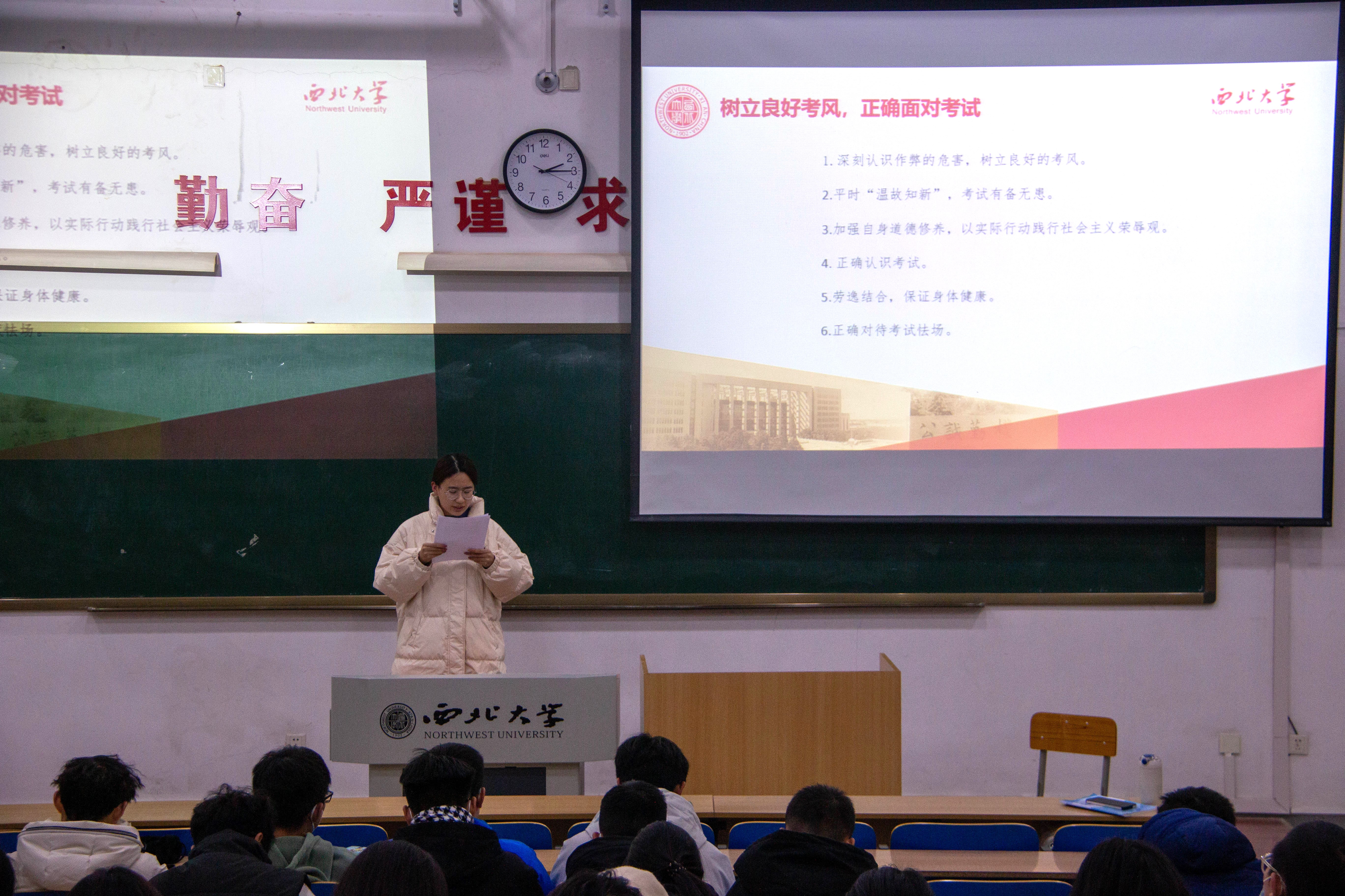 辅导员吴嘉琦老师介绍了《366net必赢官网学生违纪处分规定》的主要内容,再次提醒各位同学诚信应考,勿碰“红线”。针对2023级同学第一次参加期末考试,他特别叮嘱同学们要做好考前准备,放平心态,认真备考。