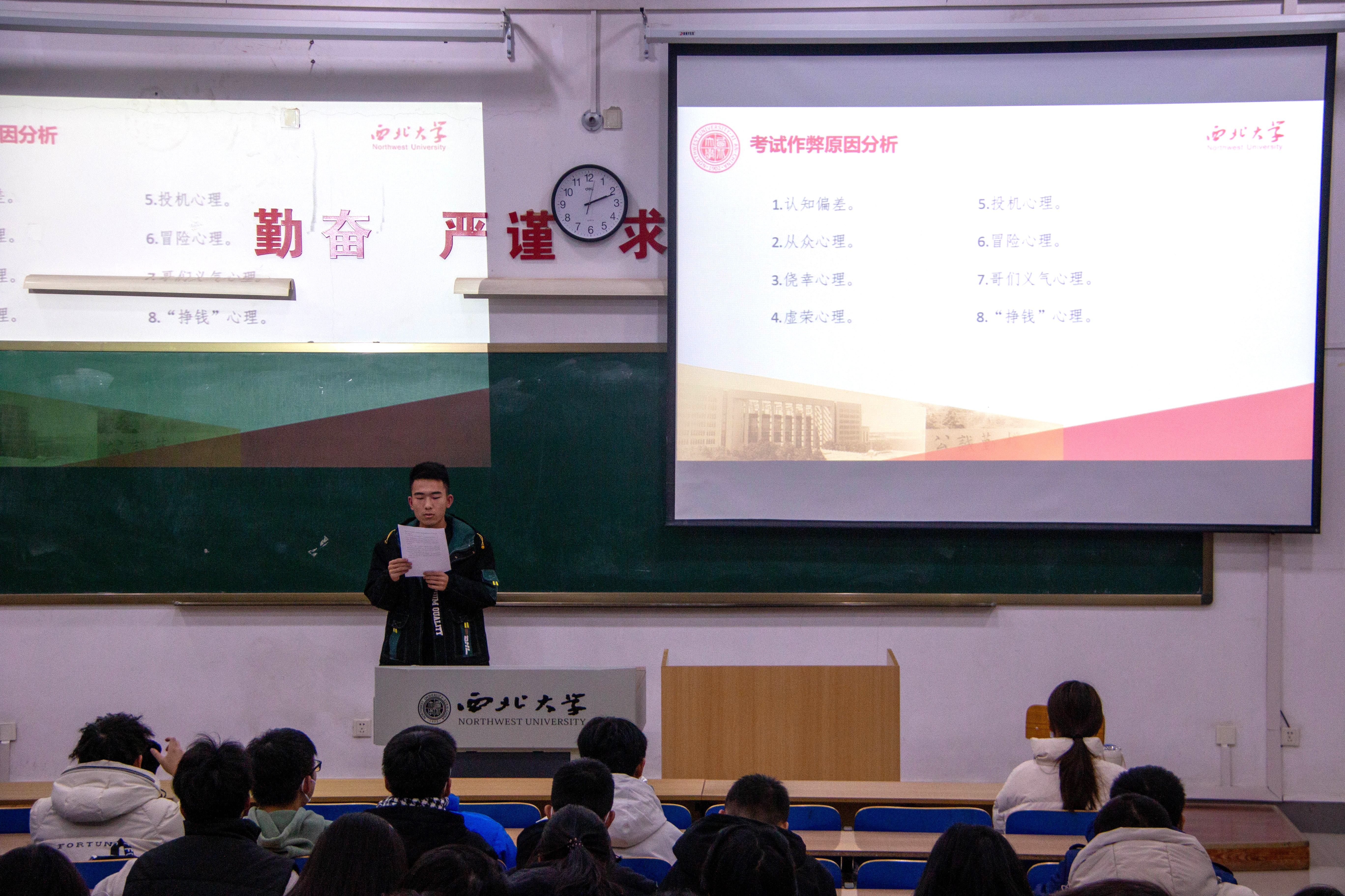 随后,四班学习委员陈君杰同学介绍了大学生作弊的心理动因,提醒同学们不断强化良好的自我意识,塑造诚信人格,明确学习目标,理智看待考试结果,以良好的心态面对考试及面对考试的结果。
