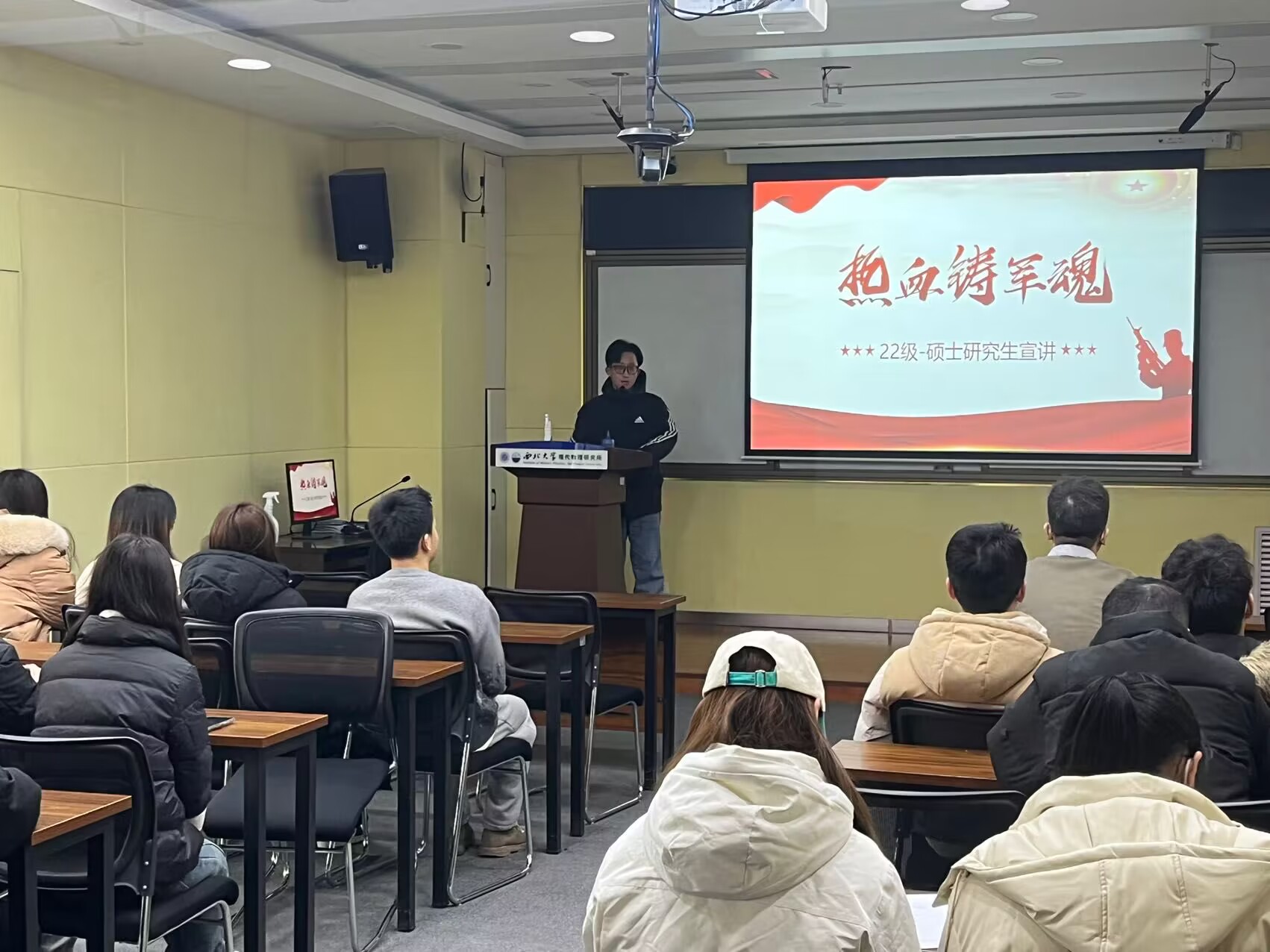 1月上旬,研究生各班班长相继面向班级同学开展征兵宣讲。班级组织播放了征兵入伍宣传片,“参军报国,青春的荣耀”“手握钢枪,青春绽放光芒;脚踏热土,步履沉淀担当;心向远方,军营成就梦想”,让同学们充分感受到了征兵氛围。同时,班长带领同学们学习了解了大学生征兵报名的基本流程、报名方式、体检标准和福利待遇等等,鼓励同学们积极响应国家号召,到部队中施展才华,为国防事业贡献力量。
