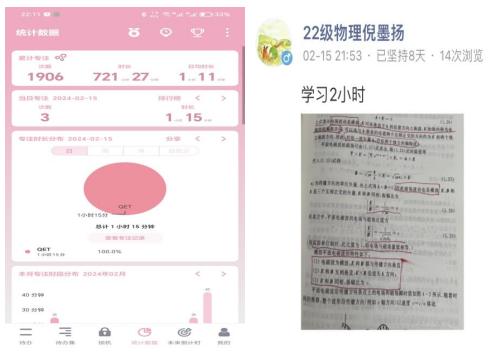 在活动中,同学们保持自律的作息,互相监督,你追我赶,让平凡的假期有了学习拼搏的热情韵味。活动期间,每天都可以看到物理学子在打卡群里打卡的身影,他们勤奋自律的样子为这个寒假染上了最美的色彩。