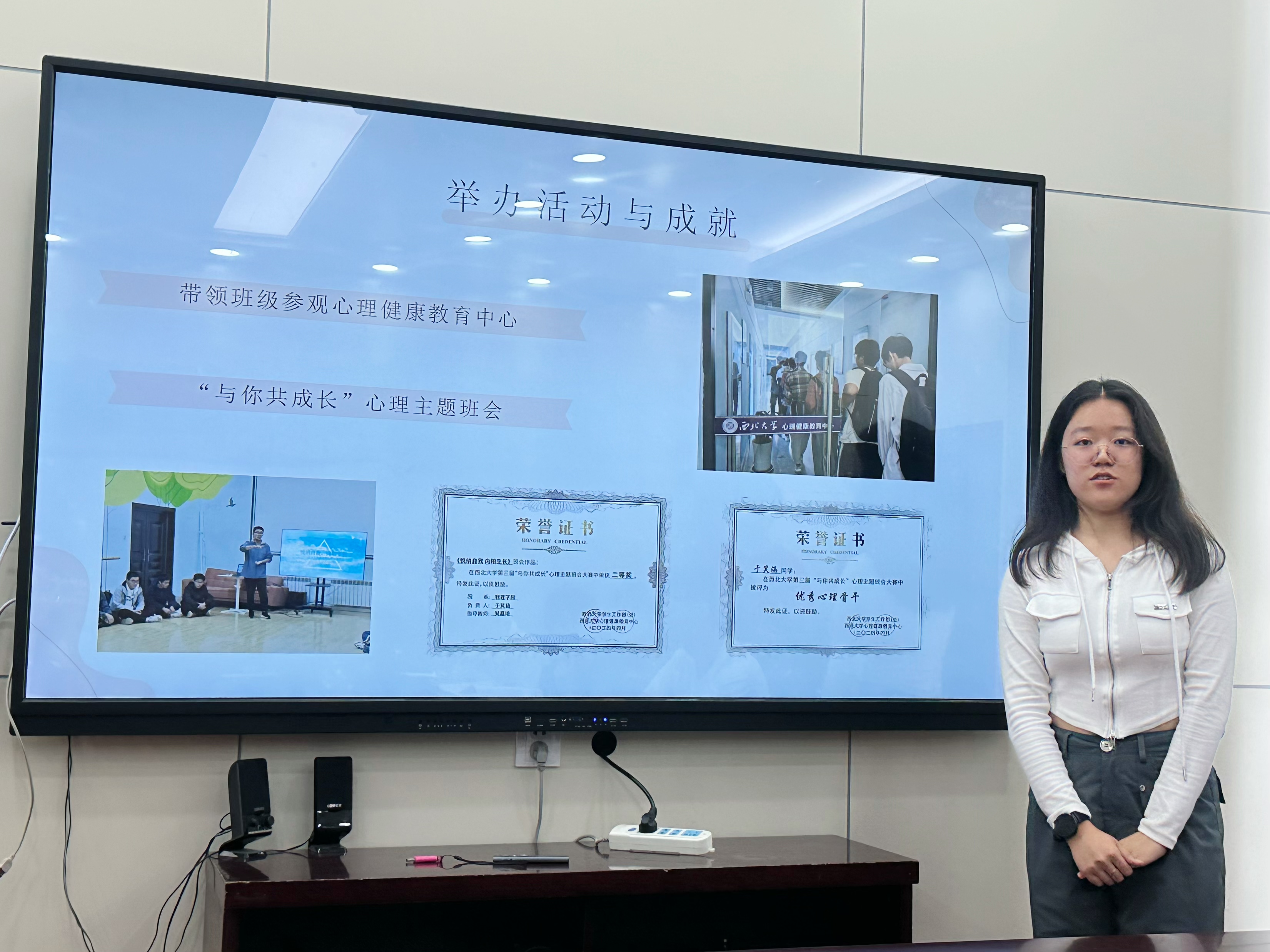 本次大赛自5月20日启动以来,经前期积极动员,开展初赛选拔,共有7名经验丰富的班级心理委员脱颖而出。决赛设置两个环节,包括工作职责阐述和心理知识竞答,综合考察选手们组织开展工作能力、理论知识储备能力及朋辈辅导能力。大赛现场,参赛选手按抽签顺序上台,分别进行自我介绍和述职报告,通过PPT演示,展示了心理委员的职责、工作重点,以及在班级心理工作中开展的特色活动。述职结束后进行心理知识竞答环节,参赛选手从十个案例库中随机抽取一组题目作答,主持人现场公布选项答案与所获分数。