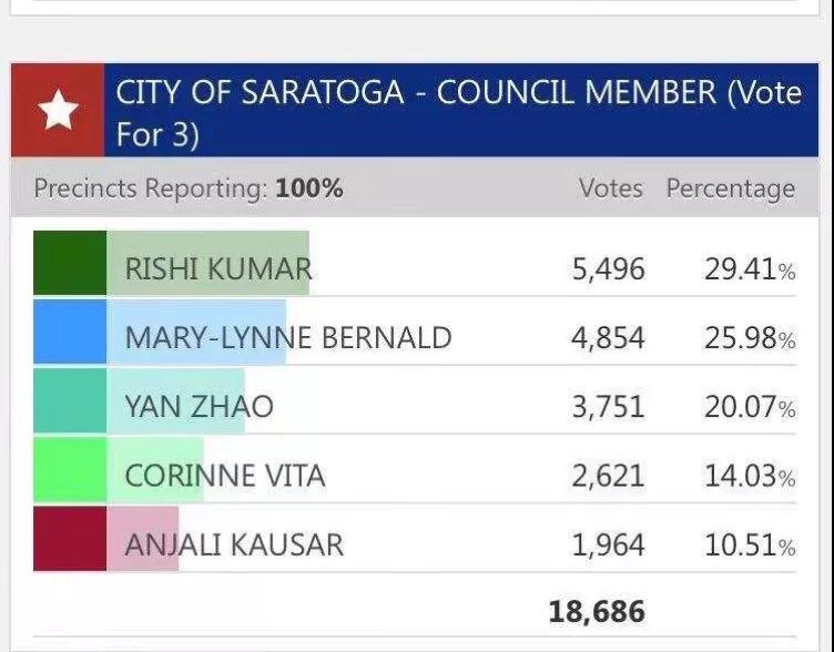 这次中期选举,也是赵嬿第三次角逐萨拉托加市议员席位,终于不负众望,赢得了11月6日的选举胜利。在5位候选人争夺3个市议员席位中出线,得票3751,以超第四名1130票当选为萨拉托加市议员!成为该市首位大陆背景的华裔女市议员。