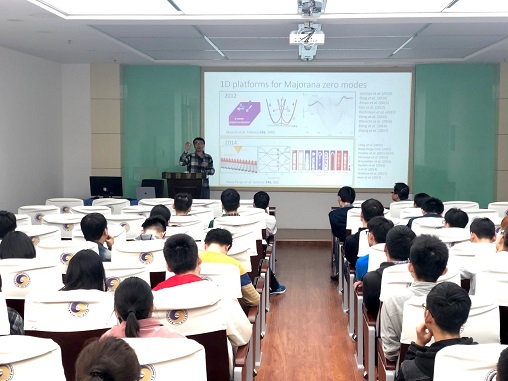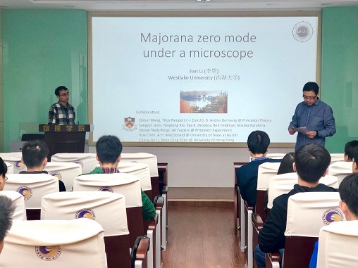 李牮研究员首先介绍了马约拉纳费米子和马约拉纳零能模,以及马约拉纳零能模研究的最新实验和理论进展,指出其独特的性质对实现拓扑量子计算有重要意义。紧接着分析了存在马约拉纳零能模的系统需要满足的条件,展示了探测及操控马约拉纳零能模的理论及实验方案。对于某些偶然出现在缺陷附近的能量为零的拓扑平庸态(YSR态),自旋极化的扫描隧道显微镜可以有效的辨别YSR态和真正的马约拉纳零能模。报告的最后,李牮老师演示了马约拉纳零能模编织构造量子逻辑门从而实现拓扑量子计算的基本思路。