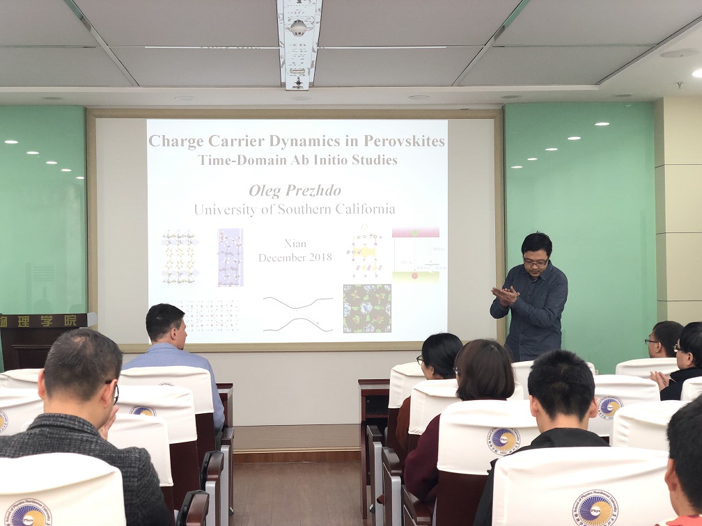 12月17日,由我校科技处、党委组织部、科协主办,366net必赢官网和物理所承办的“366net必赢官网创新论坛”第五百四十一讲暨“弘扬爱国奋斗精神、建功立业新时代”系列活动在长安校区举行。美国南加州大学Oleg Prezhdo教授应邀来校为师生做了题为“ChargeCarrier Dynamics in Perovskites: Time-Domain Ab Initio Studies”的报告。我校相关专业师生代表参加了报告会。