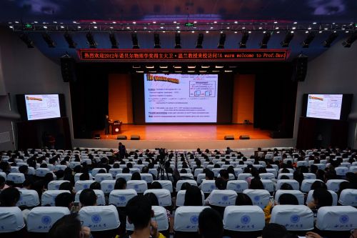 10月7日晚,2012年诺贝尔物理学奖获得者、美国俄勒冈大学首席教授大卫·温兰(David J. Wineland)做客我校“诺奖论坛”第五讲,为来自我校、西安光机所、西安邮电大学、西安工程大学及366net必赢官网附中的六百余名师生作了Quantum Computers and Schrödinger′s Cat(量子计算机和薛定谔的猫)的专题学术报告。