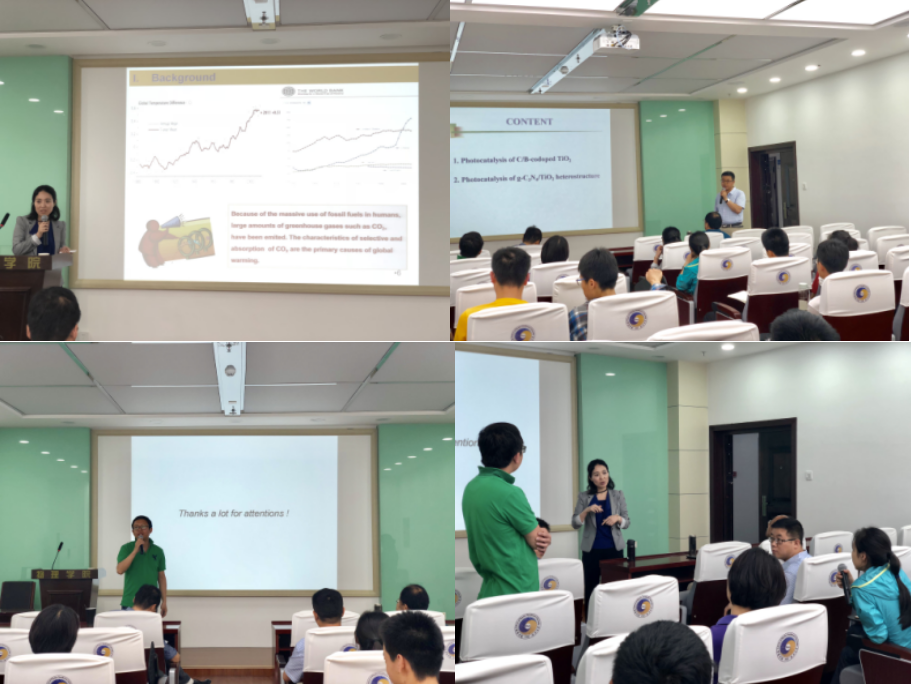 林彦明副教授以能源危机这一现象开场,引出新能源开发利用的重要性。并指出二氧化钛(TiO2) 半导体材料在太阳光的照射下能发生光催化分解水产生氢气和氧气,那么TiO2 及其某些低维半导体纳米材料的光催化就成为解决能源危机的理想途径。报告中,着重介绍了利用第一性原理计算方法研究 TiO2 及其某些低维半导体纳米材料相关的光催化机理,并向与会师生给出了相关理论结果以及该领域的发展动向。