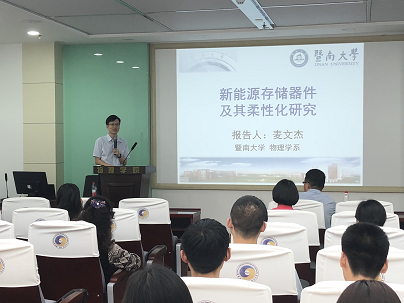 麦文杰教授主要从事纳米光电和能源材料的研究,重点研究超级电容器、太阳能电池、光电探测器等方向。已发表SCI论文约100篇,包括Science, PNAS等顶级杂志,ESI高被引论文8篇,总他引超过4400次;其中以通讯作者/第一作者发表SCI论文约50篇,包括Energy Environ Sci, Materials Today, Adv Mater, Nano Lett, ACS Nano, Angew Chem Int Ed等。本次报告会上,麦文杰教授指出了超级电容器和锂离子电池的研究具有重大的科学价值与实际意义,并,并系统的讲述了其团队围绕高性能过渡金属氧化物微纳材料电极的设计与大规模制备,固态、柔性和非对称等多种新型储能器件的构建、工作原理和组装技术及取得的相关重要研究成果。