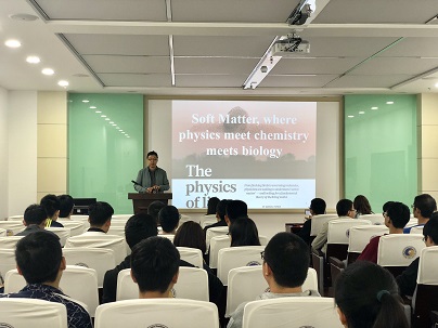 张策教授以人类的起源开场,向与会师生形象生动地介绍了软物质物理的基本概念--软物质物理是一门跨越物理、化学、生物三大学科领域的新兴学科,多指处于固体和理想流体之间的复杂态物质。并结合现有的基础研究,介绍软物质物理理论和实验研究对于生命科学,生物医学和临床应用发展的实践意义,以及学科跨领域结合的重要性。