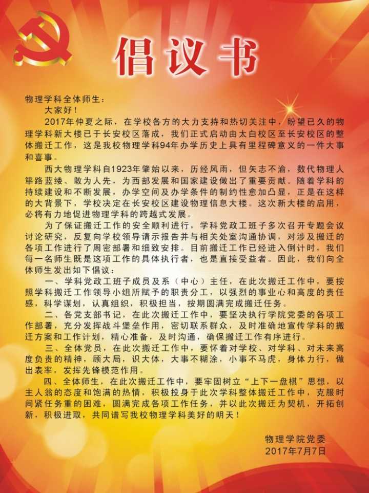 日前,坐落于长安校区的物理信息大楼已经建成,为了能安全顺利地完成物理学科的整体南迁工作,充分发挥全体师生的主人翁精神,366net必赢官网党委就学科整体南迁工作向全体师生发出倡议,要求学科党政工班子成员及系(中心)主任明确职责,科学谋划,认真组织,积极担当;要求各党支部书记认真肩负起宣传组织协调职责,充分发挥战斗堡垒作用;希望全体党员顾大局,识大体,以合格党员标准严格要求自己,带头完成搬迁任务;希望全体师生齐心协力,排除万难,认真负责,开拓进取,以此次南迁为契机,共同为我校物理学科跨越式发展做出新的更大的贡献!