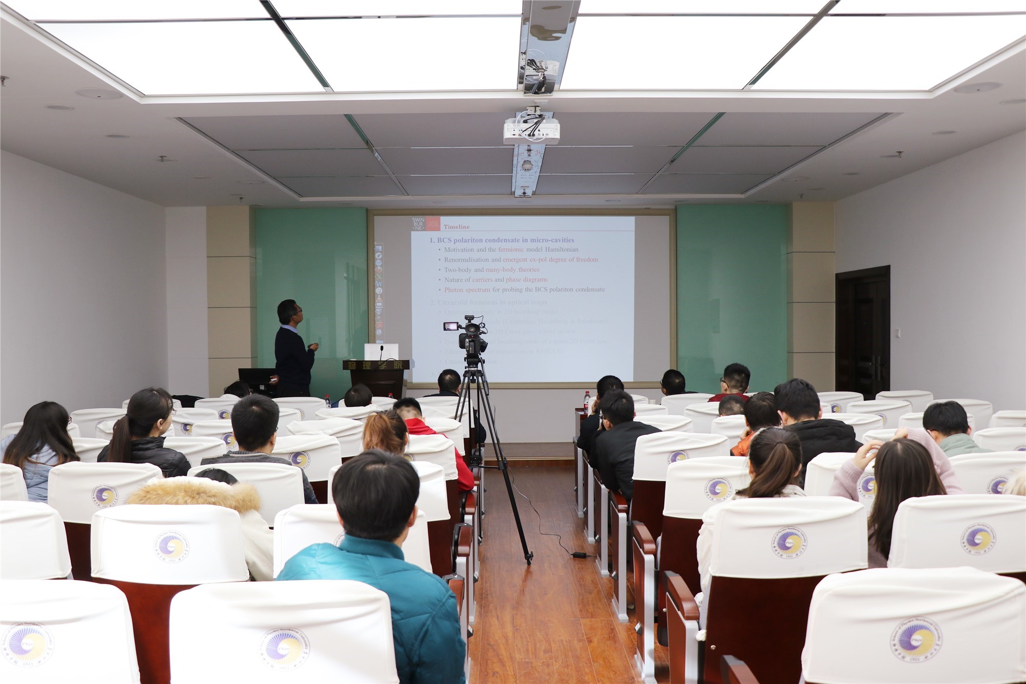 胡辉教授首先介绍了BEC(Bose-Einstein-Condensation)-BCS(Bardeen-Cooper-Schrieffer)过渡等方向的研究是近年来冷原子领域的热点之一。随后,胡辉教授讲述了当载流子密度达到Mott跃迁密度时,微腔电子空穴光子系统表现出从BEC到BCS超流体的交叉。最后胡辉教授向大家展示了斯威本大学理论小组关于通用BEC-BCS交叉物理学的一些最新结果。