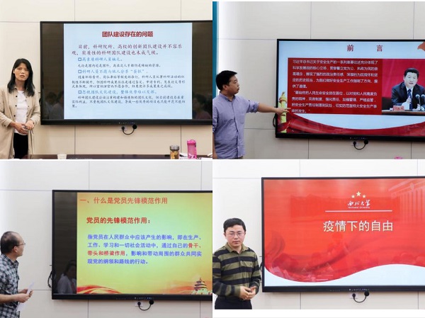 本次微党课比赛,参赛选手均围绕支部中心工作和党员思想实际,精心准备了具有支部特色的党课,比赛讲授中声情并茂、精彩纷呈。教工第一党支部书记朱秀红以“浅谈对科研的几点思考”为题,讲授了教师党员在科研团队建设和科研品牌创建中的带头作用和榜样力量;教工第二党支部宣传委员胡鹏围绕学习贯彻习近平总书记“关于安全生产的重要论述”,讲授“加强实验室安全管理”党课;光子所第一党支部书记孙博结合支部成员学习工作实际,讲授“党员在疫情期间的作用发挥”党课;光子所第二党支部书记徐新龙以“疫情下的自由”为题,通过中外客观比较,生动阐释了中国共产党的坚强领导和卓有成效;光子所第三党支部宣传委员王贝贝以“战疫情,党旗在飘扬”为题,讲述了支部党员加强理论学习、停课不停学、科研永向前的具体实践和收获体会;研究生党支部书记高雪依通过回顾习近平总书记的插队经历,讲授“习近平知青岁月对青年成长的启示”党课;本科生物理学党支部书记严少珍以“筑牢理想信念之基,做新时代有为青年”为题,讲授当代青年如何树立正确的理想信念;本科生光信党支部书记段钰从家国情怀、榜样力量、战疫事迹等方面,讲述了何为共产党人的初心。