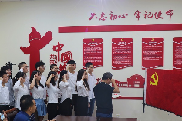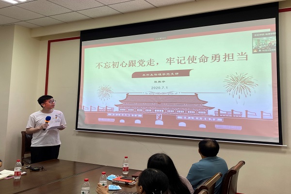 在“迎党的生日、讲战疫故事、悟初心使命”活动中,新晋党员代表在党旗前庄严宣誓。学院相关负责人为党员代表佩戴党徽、颁发“党员政治生日贺卡”、赠送纪念品。赵立臣代表新晋党员表态发言,表示要坚定地继承和发扬老一辈物理学家的优良传统,把党性锤炼铭记心间,让物理榜样照亮心房,积极践行习近平总书记有理想信念、有道德情操、有扎实学识、有仁爱之心的“四有”好老师要求。6名老党员代表围绕入党记忆、感想体会、疫情下作用发挥以及寄语新晋党员等方面进行发言交流。