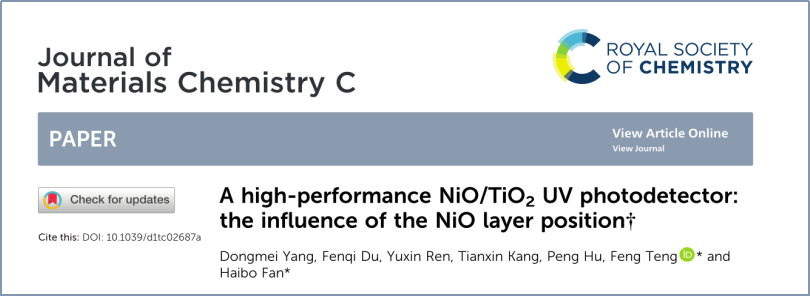 近日,必赢范海波教授课题组在英国皇家化学学会期刊Journal of Materials Chemistry C上发表封面文章,题为“A high-performance NiO/TiO2 UV photodetector: the influence of the NiO layer position”。该文章通过旋涂法和电沉积法方法,构造了两种不同结构的TiO2紫外光电探测器件,通过对比研究了NiO层及其位置对器件性能的影响,并且获得了性能优异的紫外光电探测器件,为其实用化提供了可能。