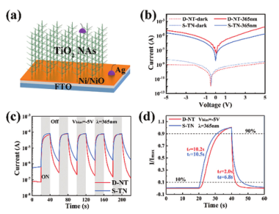紫外(UV)光电探测器(PDs)由于在光通信、环境监测、化学生物传感、未来存储和光电子电路等各种工业和军事的巨大应用前景而引起了广泛关注。近几十年来,各种宽带隙半导体包括SiC、Ga2O3、GaN、ZnO、ZnS、NiO和TiO2等被用于制备UV PD。TiO2因其高紫外吸收系数、优异的化学稳定性、低成本和环境友好等特性被广泛制作为高度敏感的紫外线器件。由于TiO2纳米粒子中光产生载流子的低迁移率和高复合率,研究中常用基于一维纳米结构的纳米阵列(NAs)来构建紫外光电探测器,但是单一的TiO2纳米阵列器件却存在响应时间过长的难题。