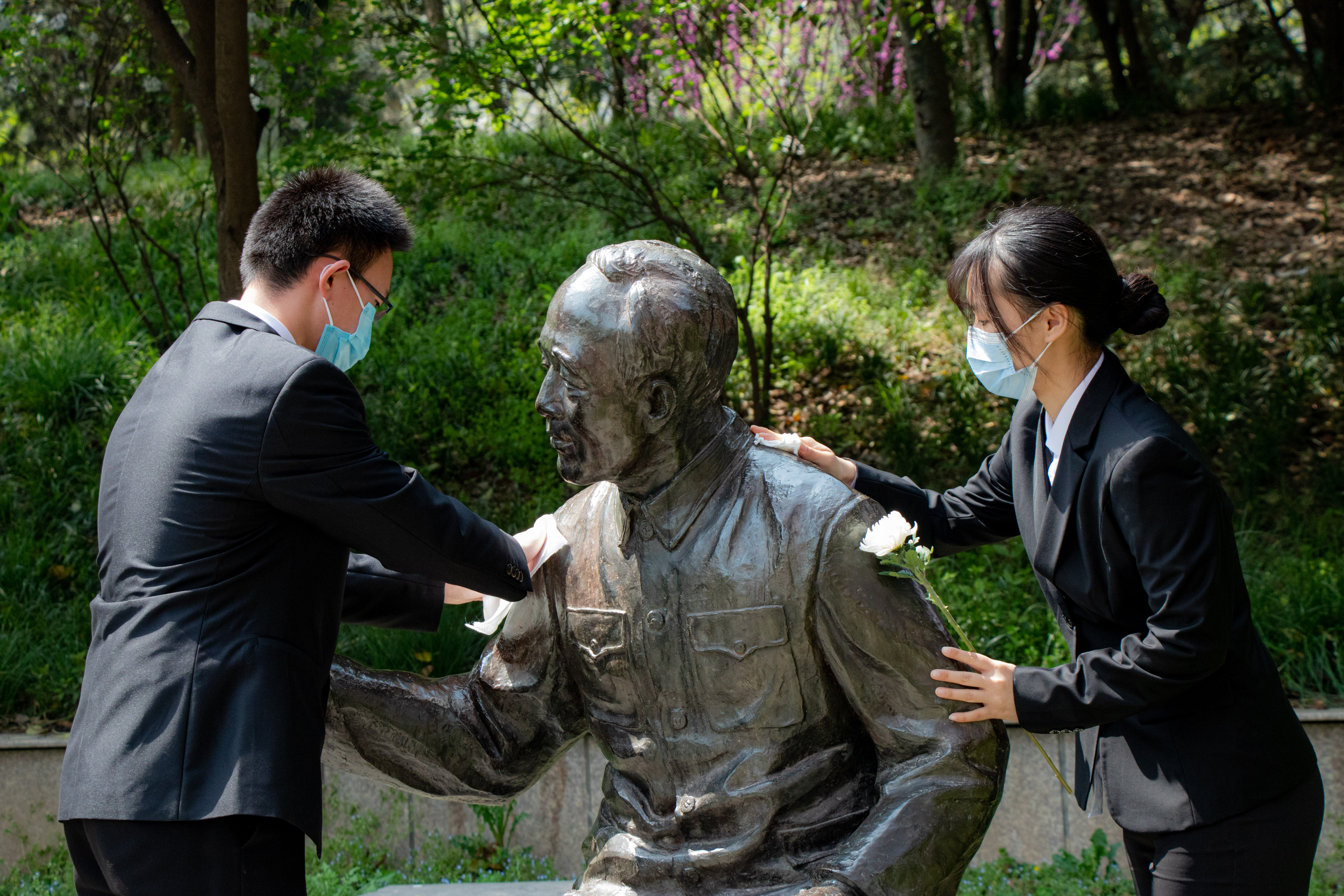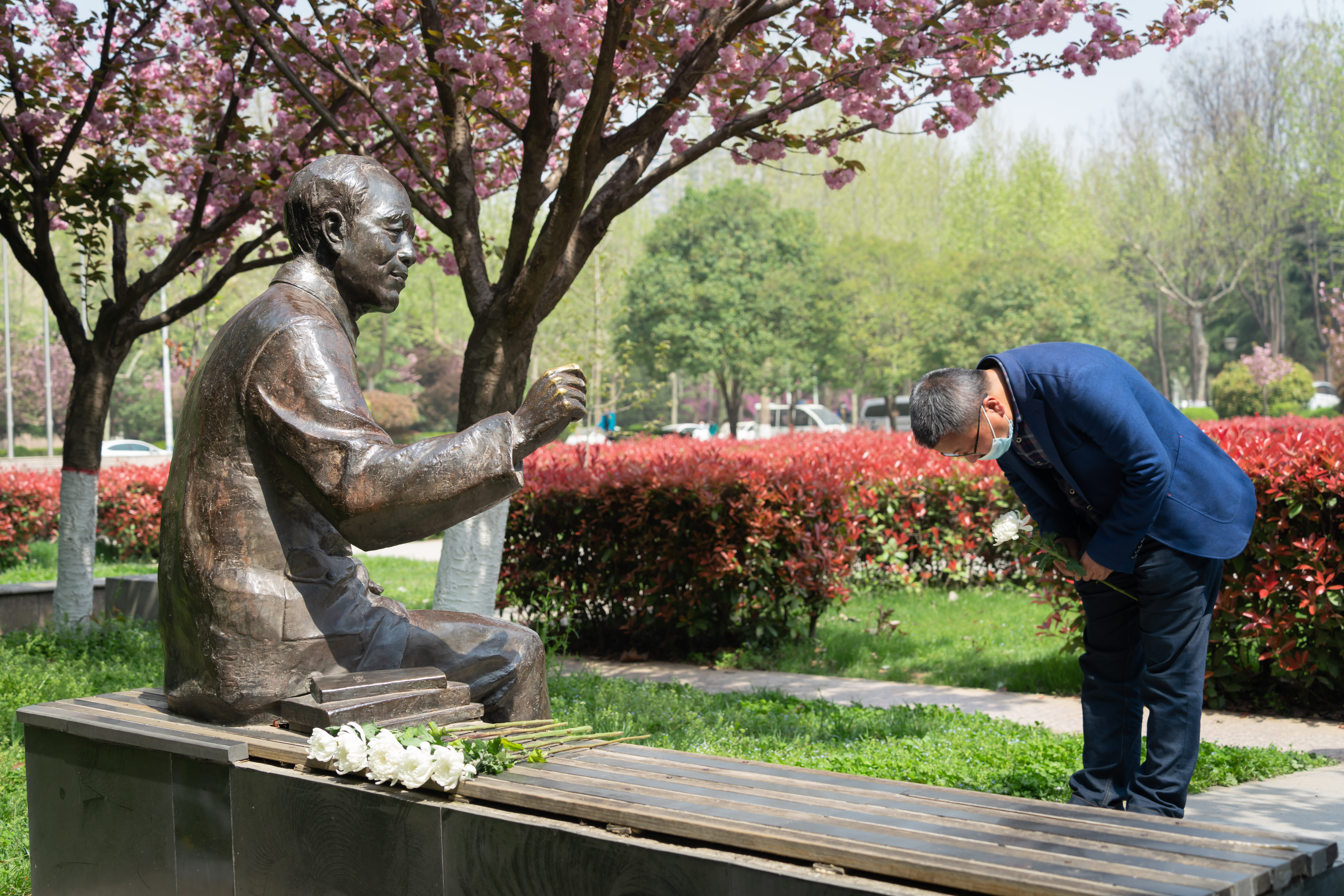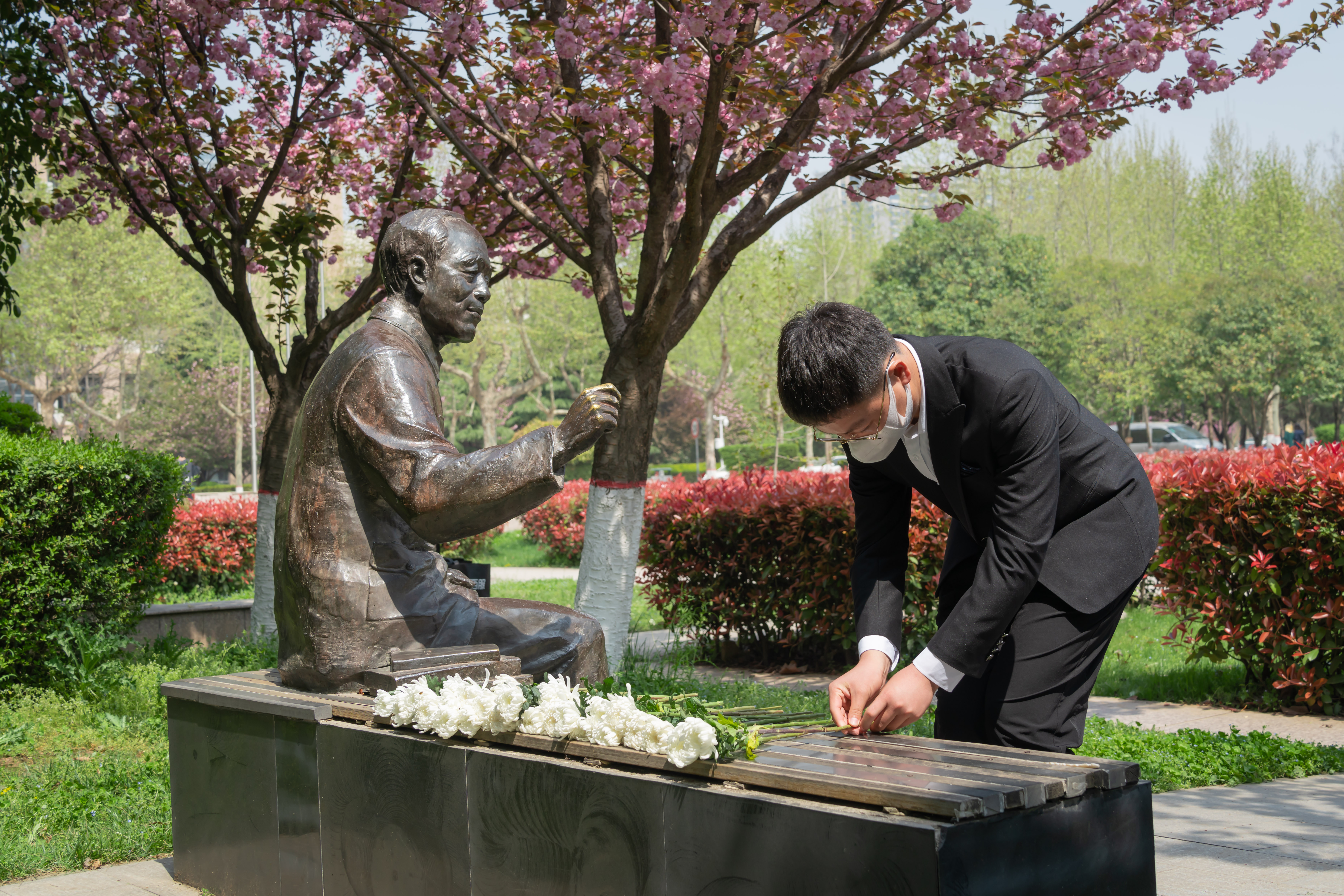 最后,师生面向侯伯宇先生雕像三致深躬表达敬意,并向侯先生雕像献花以致哀思。