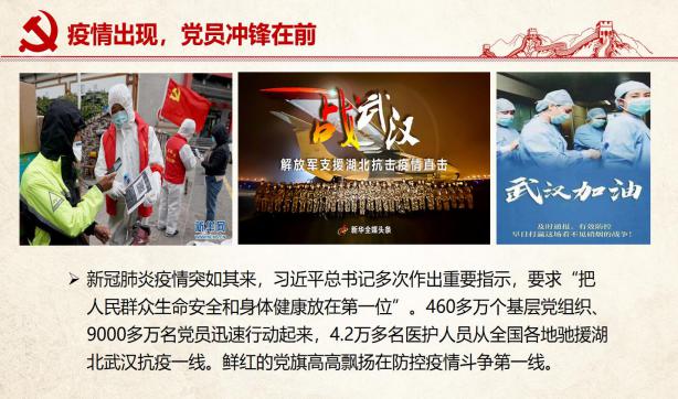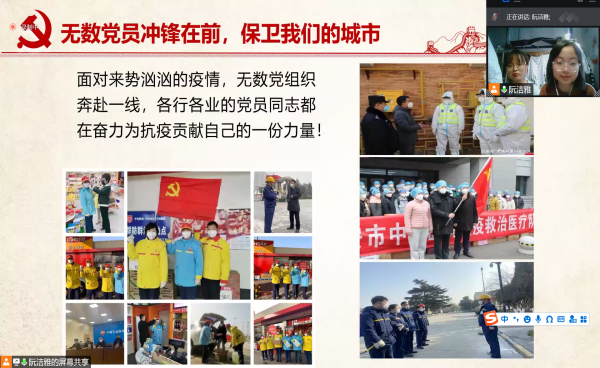 接着,支部党员王熔和阮洁雅进行了“疫情下的党员担当”主题微党课的分享。王熔用一组组数据和照片生动地讲述了新冠疫情下,党中央快速部署,各级党组织迅速成立突击队支援疫区,一大批党员同志奔赴一线勇敢逆行,让大家深刻地感受到了幸福生活的来之不易。阮洁雅以抗击疫情的防控工作为线索,和大家分享了医护人员、外卖小哥、老师、志愿者等不同职业的党员同志迎难而上的抗疫故事,尤其是本支部党员在疫情中不惧艰险、迎难而上的先进事迹。他们用自己的实际行动抗击疫情,在寒冷的冬日温暖了更多人的心。不同人群的抗疫故事,身边党员一个个挺身而出的勇敢,也让支部党员进一步明确了自己的责任和义务,增强了抗击疫情的信心,大家纷纷表示要积极为抗疫工作贡献自己的一份力量。