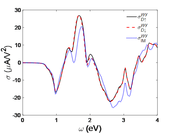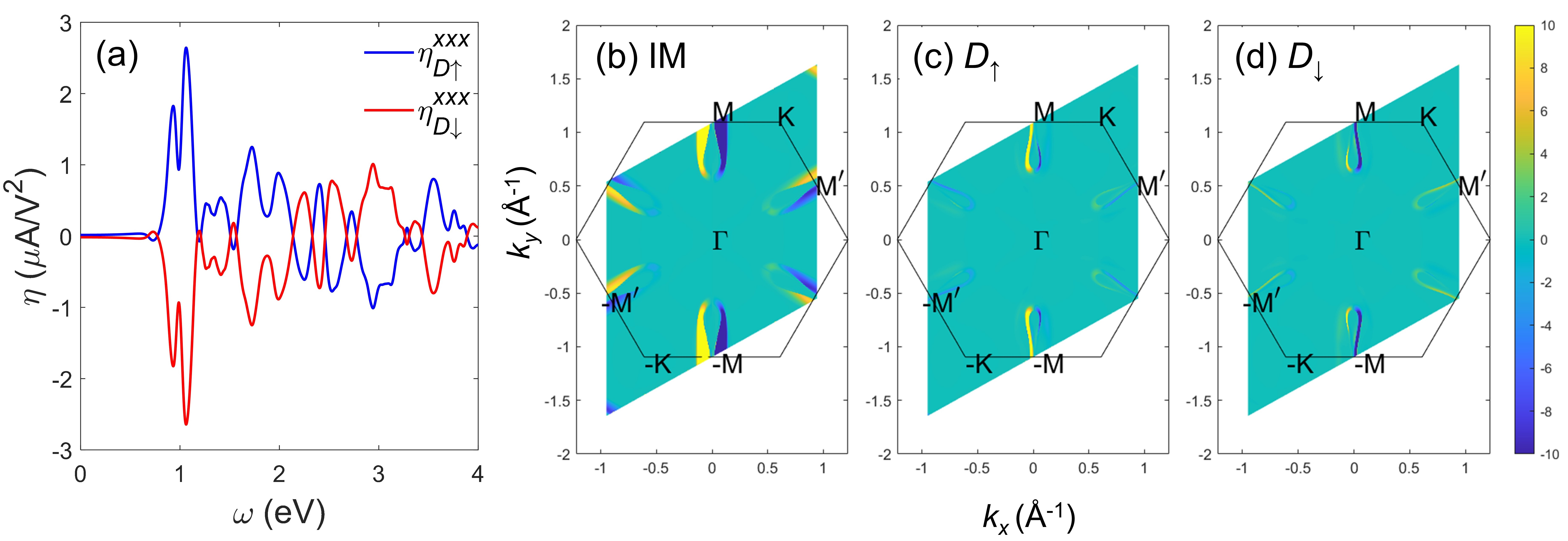 最近,研究发现在磁性体系中,体光伏效应产生额外的磁性项,磁性移位电流(magnetic shift current)和磁性注入电流(magnetic injection current)。在线偏振光照射下,磁性体系中通常会同时存在普通移位电流(normal shift current)和磁性注入电流。因此为了探究磁性体系中体光伏效应的可调控性,人们可以借助于自旋甚至自旋和电极化自由度的共同作用调控体系对称性。
