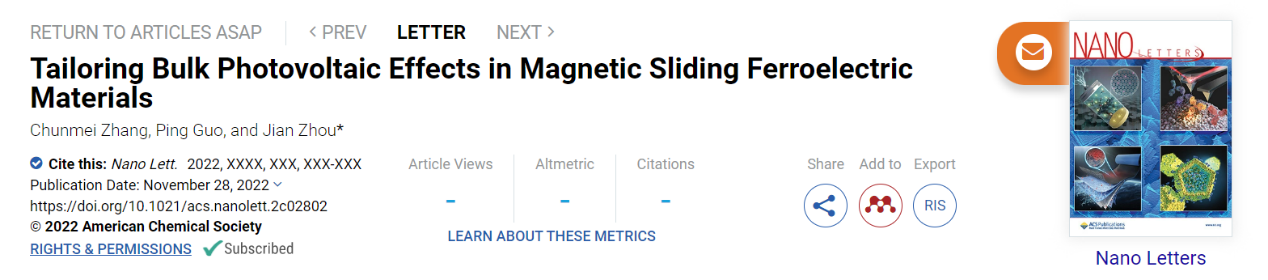 同时破缺的磁性滑移铁电体系中, 面外电极化和磁矩方向可以共同调控面内磁性光电流的方向,并且在三种不同的体系中得到理论计算验证。研究成果于2022年11月28日发表在凝聚态物理著名期刊Nano Letters上。