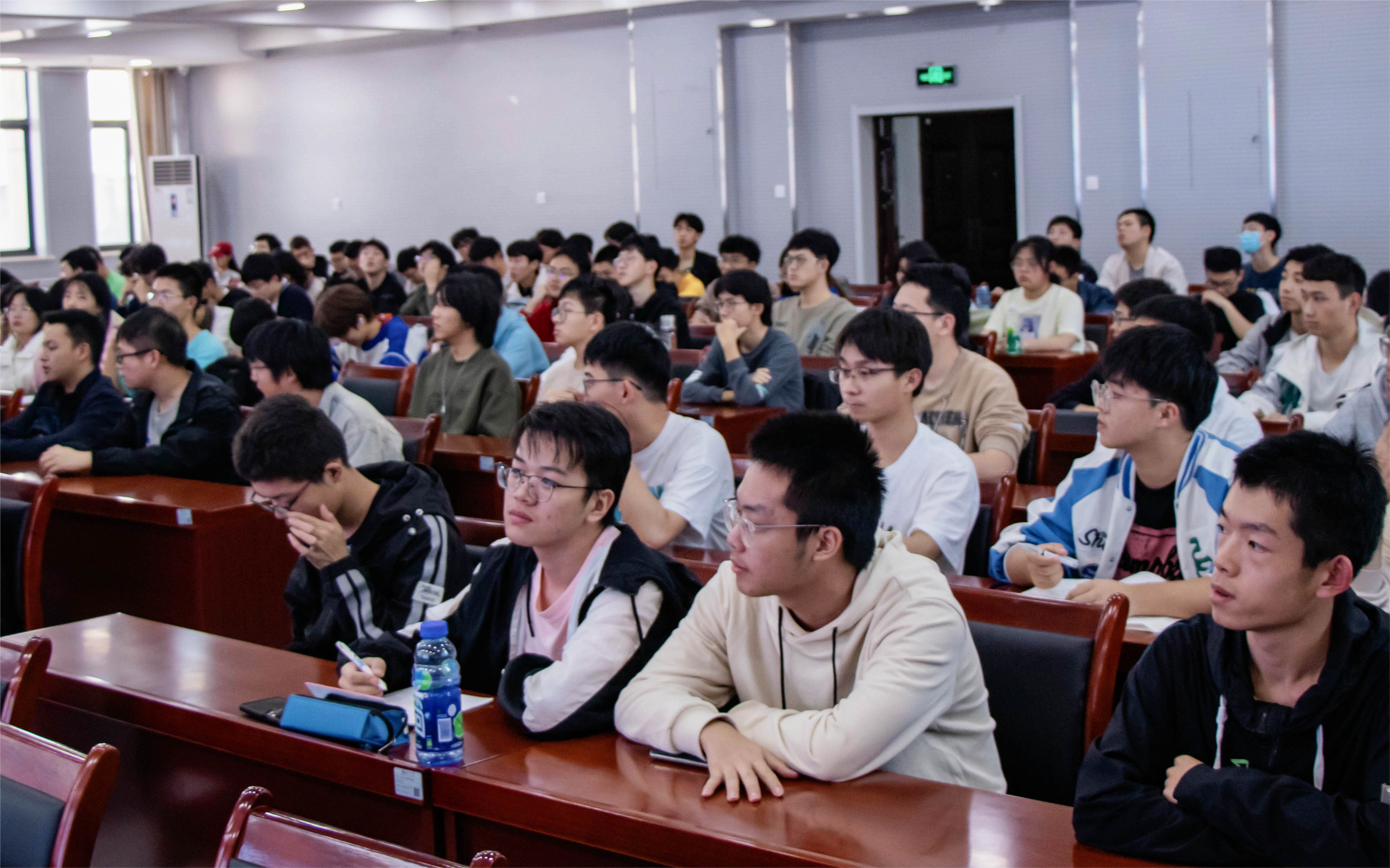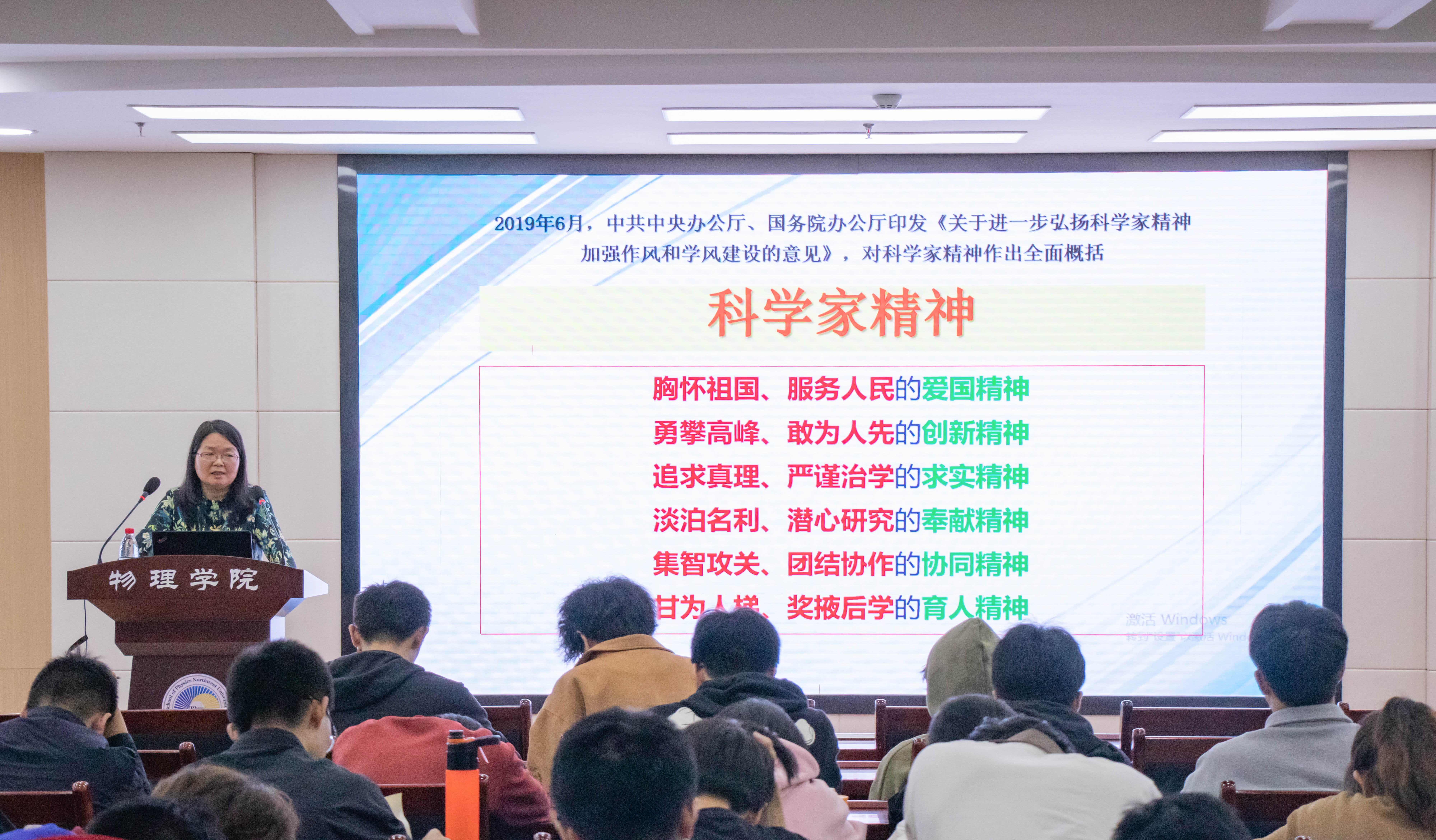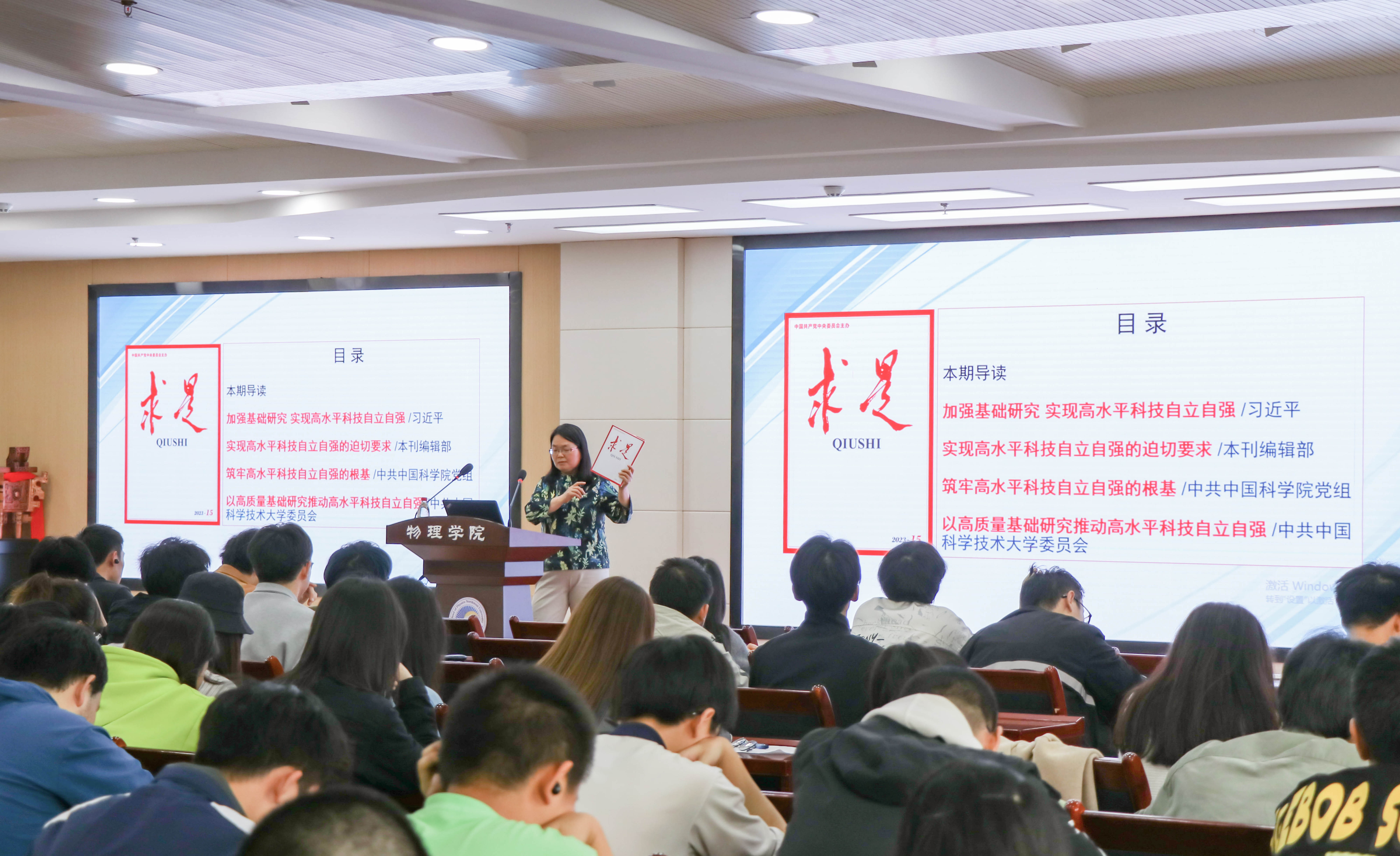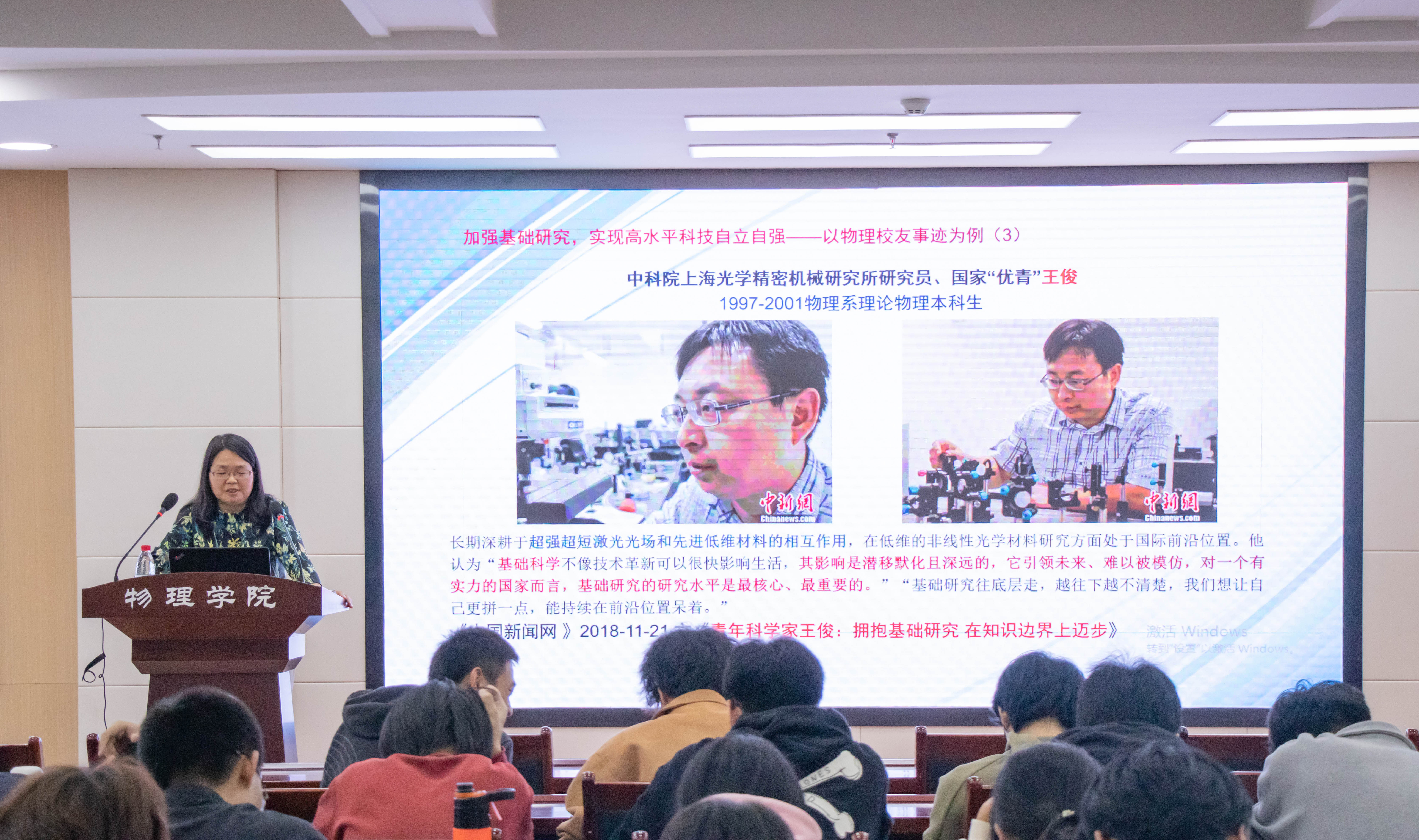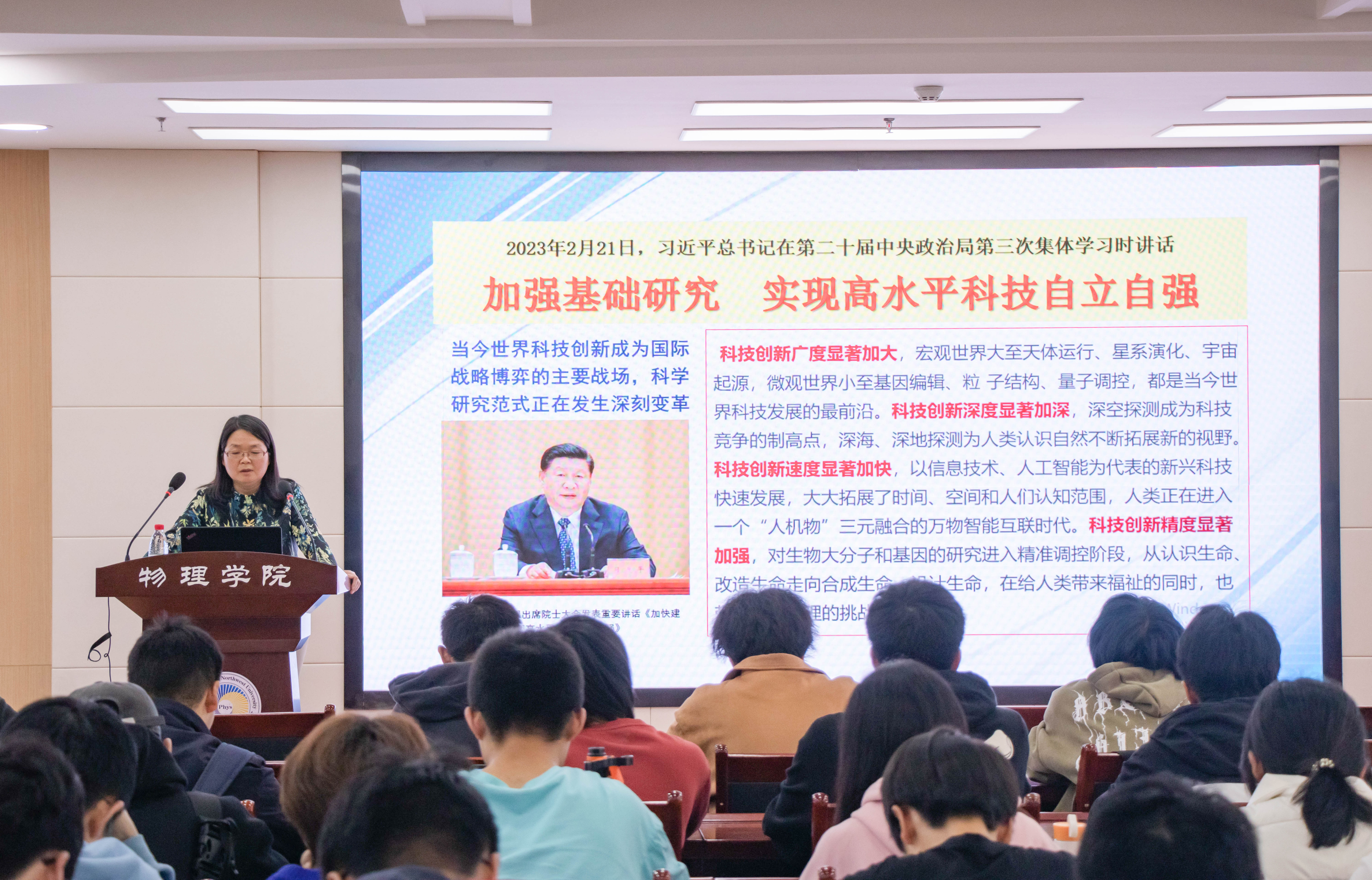张军丽书记分三个部分展开讲述。第一部分,她带领大家学习了习近平总书记在第二十届中央政治局第三次集体学习时的讲话《加强基础研究,实现高水平科技自立自强》及相关学习贯彻落实文章,引导同学们深刻理解新时代加强基础研究的内涵和战略意义,激励同学们树立躬行实践、努力以高质量的基础研究工作推动我国高水平科技自立自强的雄心壮志。第二部分,张军丽书记介绍了物理校友在基础研究中的生动实践范例,重点讲述了中国科学院国家授时中心主任张首刚、副主任卢晓春,中科院上海光学精密机械研究所研究员、国家级人才王俊、林楠,西湖大学创校校董会成员、理学院特聘研究员、国家级人才李牮,上海交通大学物理与天文学院教授、国家级人才李听昕等六位物理校友在基础研究方面的执着坚守和突出成绩,让同学们深入理解基础研究在科技强国中的核心地位和重要作用,勉励新时代物理学子向优秀校友学习,及早制定学业发展规划,奠定专业知识基础,提升创新思维能力。第三部分,张军丽书记讲述了传承科学家精神夯实基础研究的科学素养的必要性,重点强调了伟大建党精神之一的科学家精神的本质内涵以及对加强基础研究的重要性,指出一部科学史就是一部科学家的精神史,号召同学们胸怀祖国、矢志创新,从攻克每一道难题做起,日积月累提升科学素养,争做重大科研成果的创造者,建设科技强国的奉献者,崇高思想品格的践行者,良好社会风尚的引领者。