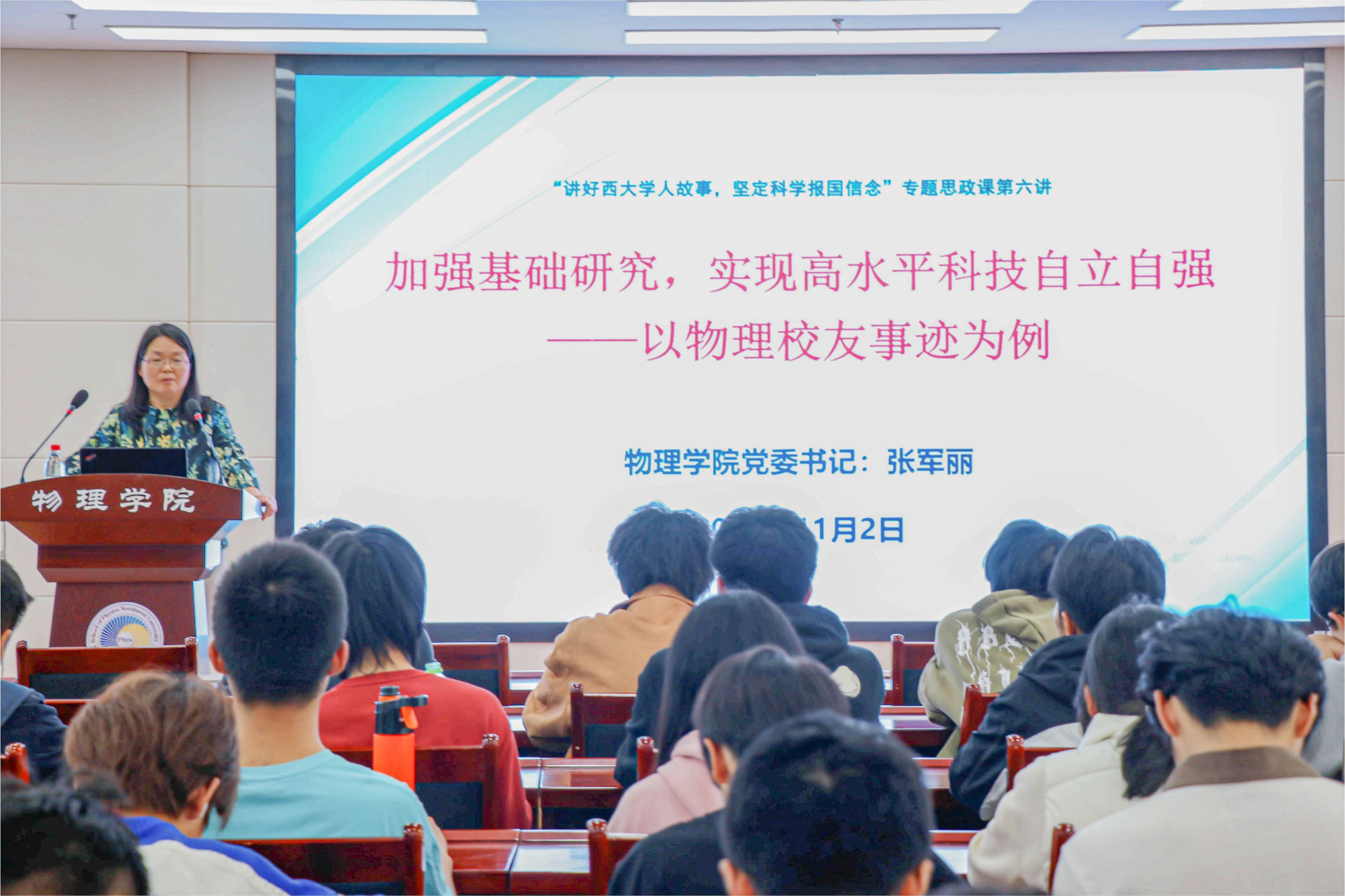 为弘扬科学家精神,激励和引导广大青年学子坚定科学报国信念,11月2日下午,366net必赢官网党委书记张军丽在学院伯宇报告厅为2022级本科生讲授“讲好西大学人故事,坚定科学报国信念”专题思政课第六讲“加强基础研究,实现高水平科技自立自强——以物理校友事迹为例”。2022级全体本科生参加了此次学习活动。