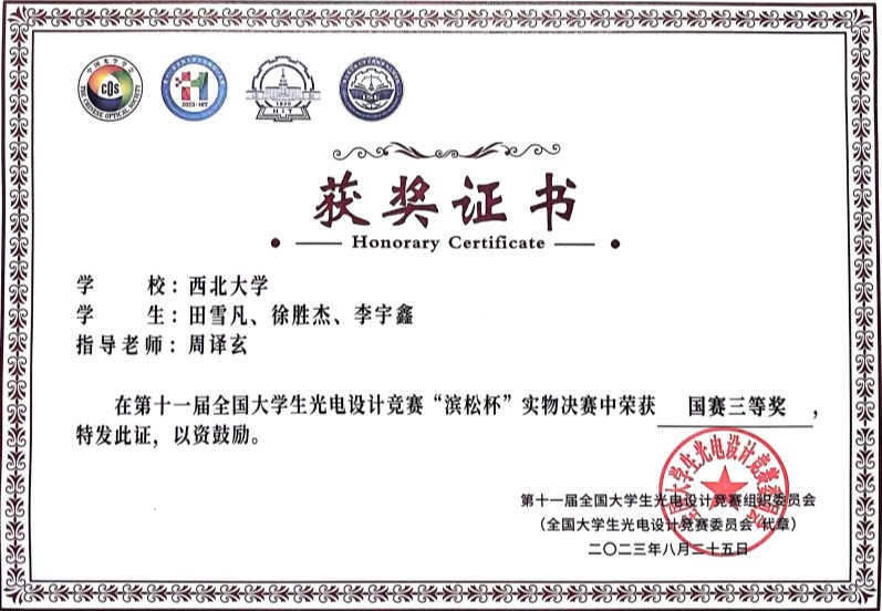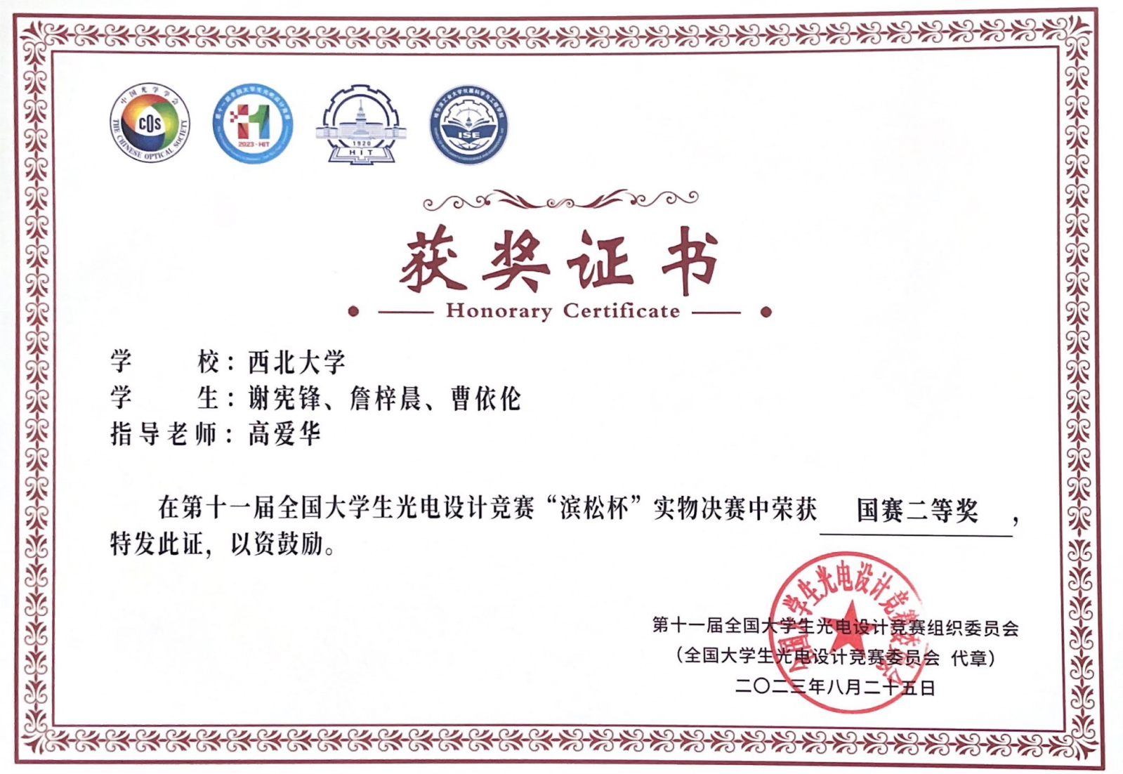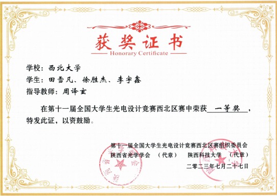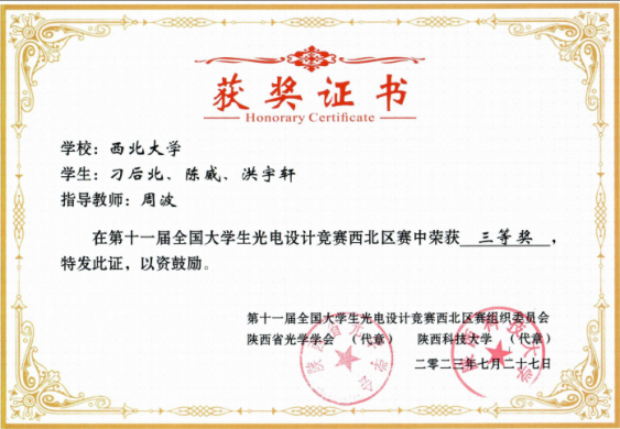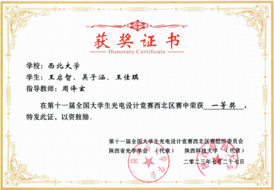 全国大学生光电设计竞赛是由中国光学学会主办、中国光学学会光学教育专业委员会代表主办机构、全国大学生光电设计竞赛委员会具体负责的一项全国高校光电类专业重要的学科竞赛赛事,正努力打造成公认的光电专业领域规模最大、影响力最大的一项具有导向性、示范性的全国学科竞赛。赛事为全国光电及相关专业学生综合运用所学知识开展科研实践活动提供了国家级的权威交流平台。我们的队员在其中大显身手,共3人获得国赛一等奖(一项),3人获得国赛二等奖(一项),3人获得国赛三等奖(一项),9人获得西北地区赛一等奖(三项),1人获得西北地区赛二等奖(一项),1人获得西北地区赛三等奖(一项)。