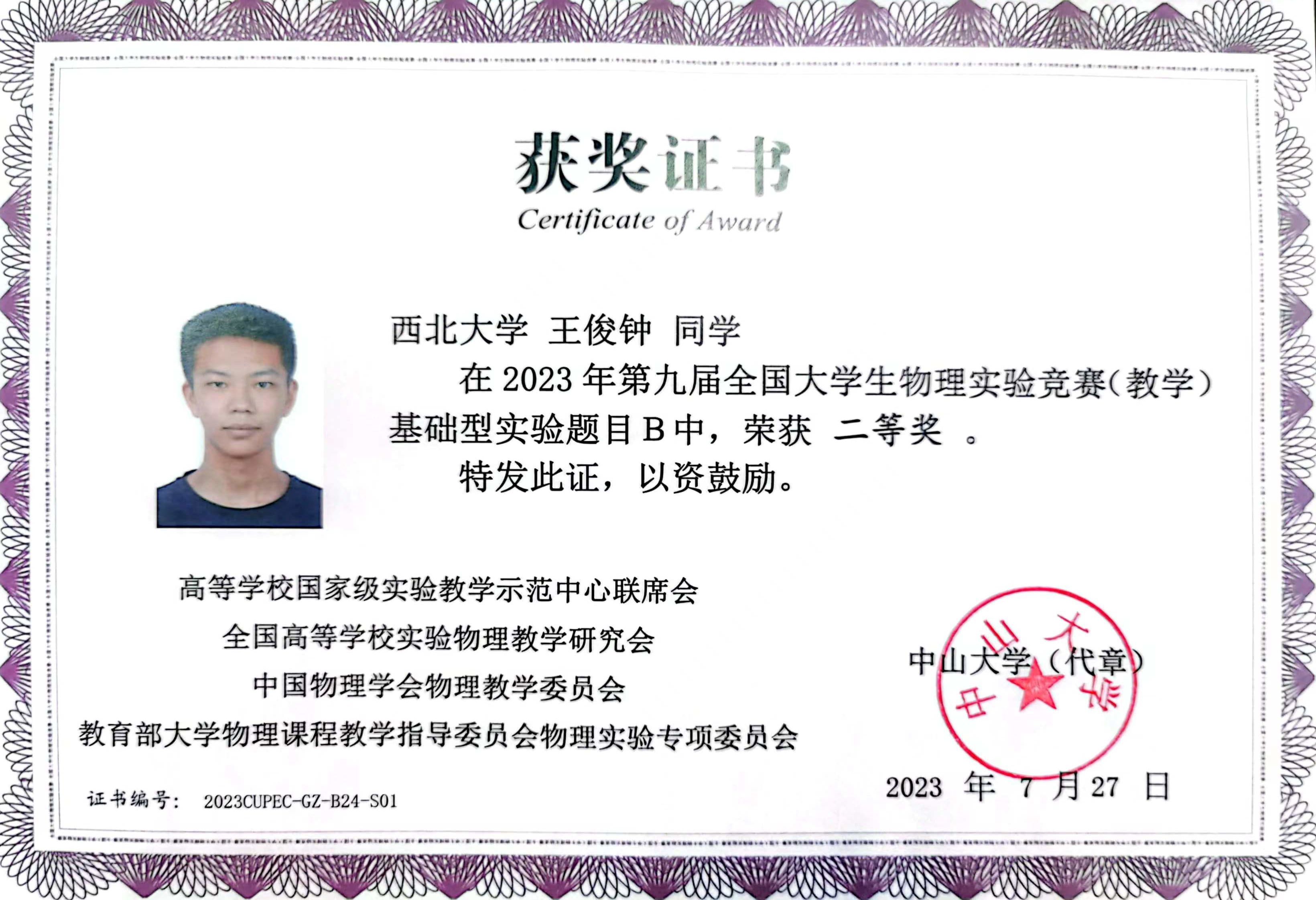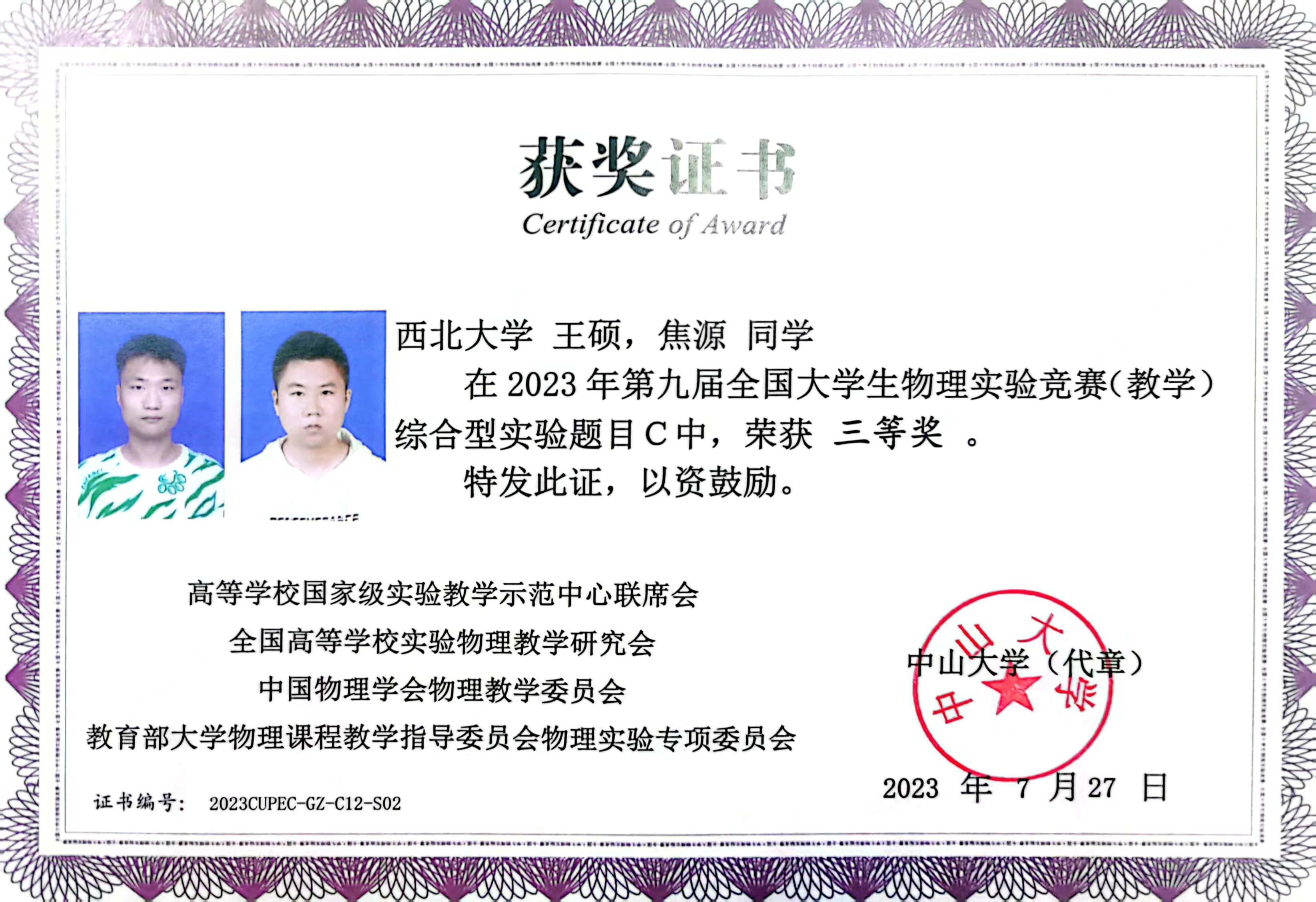 全国大学生物理实验竞赛(简称CUPEC)是教育部高教司批准的全国性大学生竞赛项目,已列入到中国高等教育学会学科竞赛名单,属于A类全国赛事,竞赛旨在激发大学生对物理实验的兴趣与潜能,培养大学生的创新能力、实践能力和团队协作意识,促进物理实验教学改革。竞赛分为基础性实验和综合性实验两类,每个参赛学校可最多派出4名选手,分别参加基础A和B,综合C或D三场比赛,每场比赛4个小时,参赛高校抽签决定比赛次序和题型。2023年7月,第九届全国大学生物理实验竞赛(教学)在中山大学举行。经过细致、严谨的备赛,我校参赛队伍中,王俊钟同学获得基础组二等奖、张鹏同学获得基础组三等奖,焦源、王硕两位同学获得综合组三等奖。