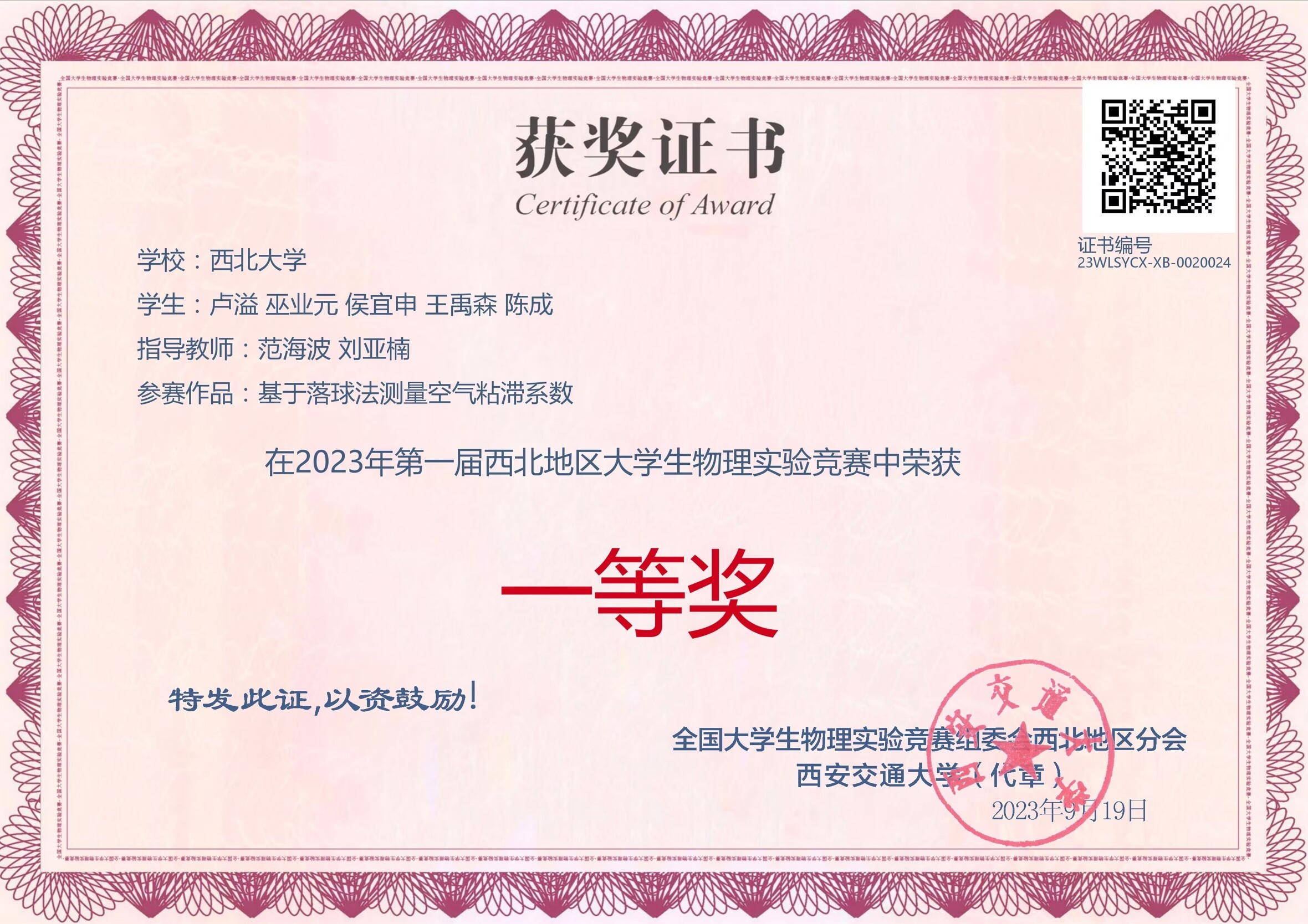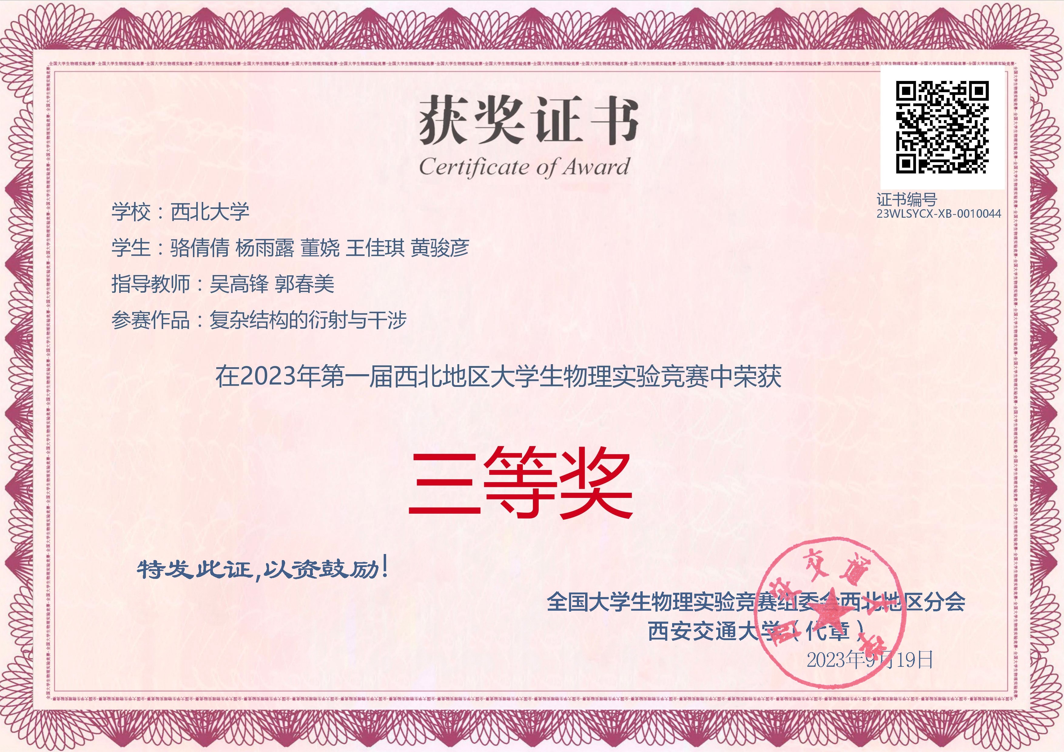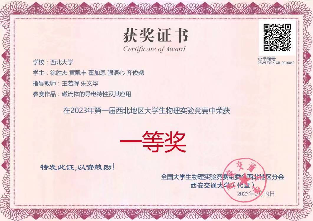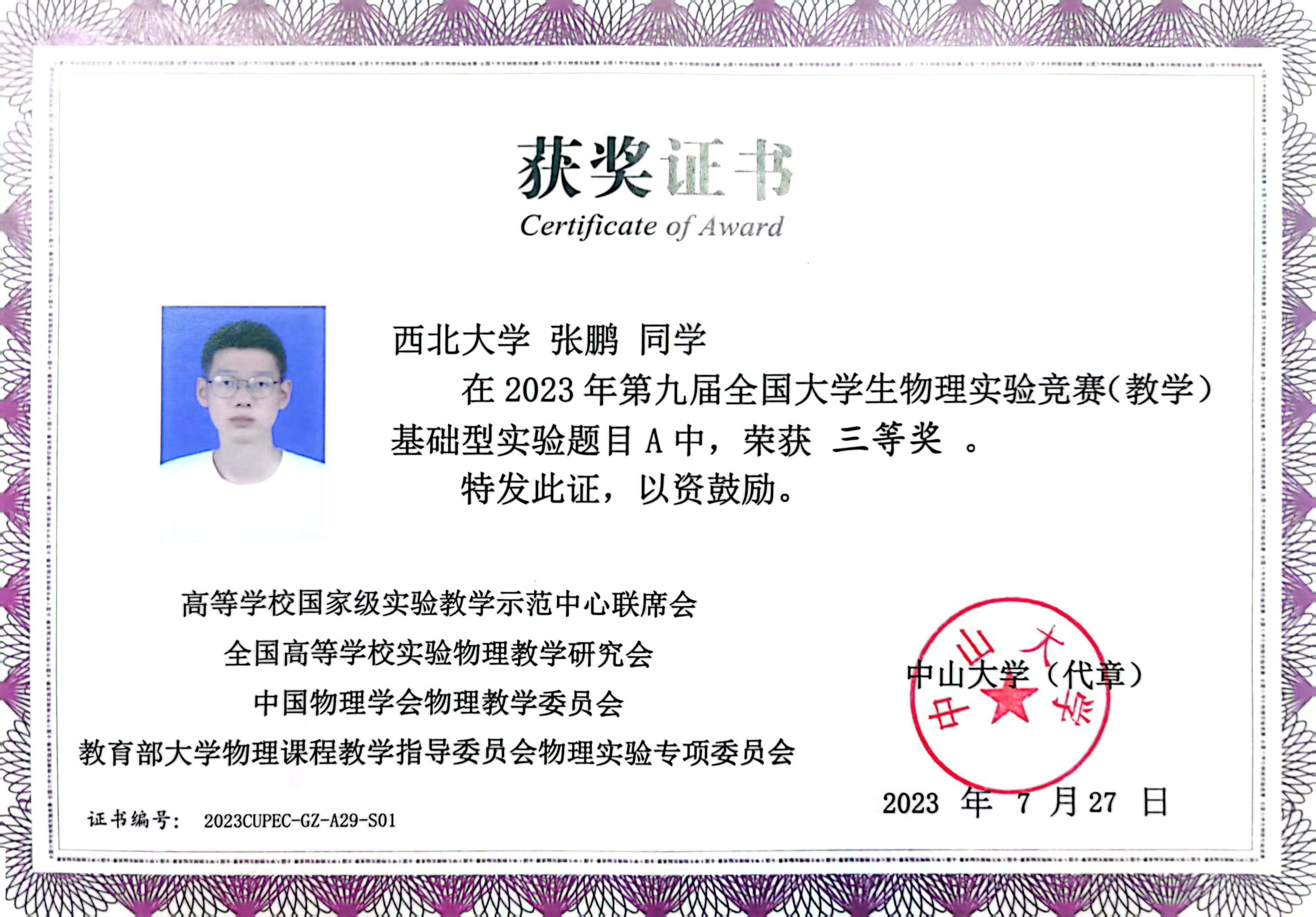在全国大学生物理实验竞赛(创新)中,必赢学子崭露头角,5人获得全国一等奖(一项),15人获得全国二等奖(三项)。在西北地区赛中,10人获得地区赛一等奖(二项),5人获得地区赛二等奖(一项),10人获得地区赛三等奖(二项)。