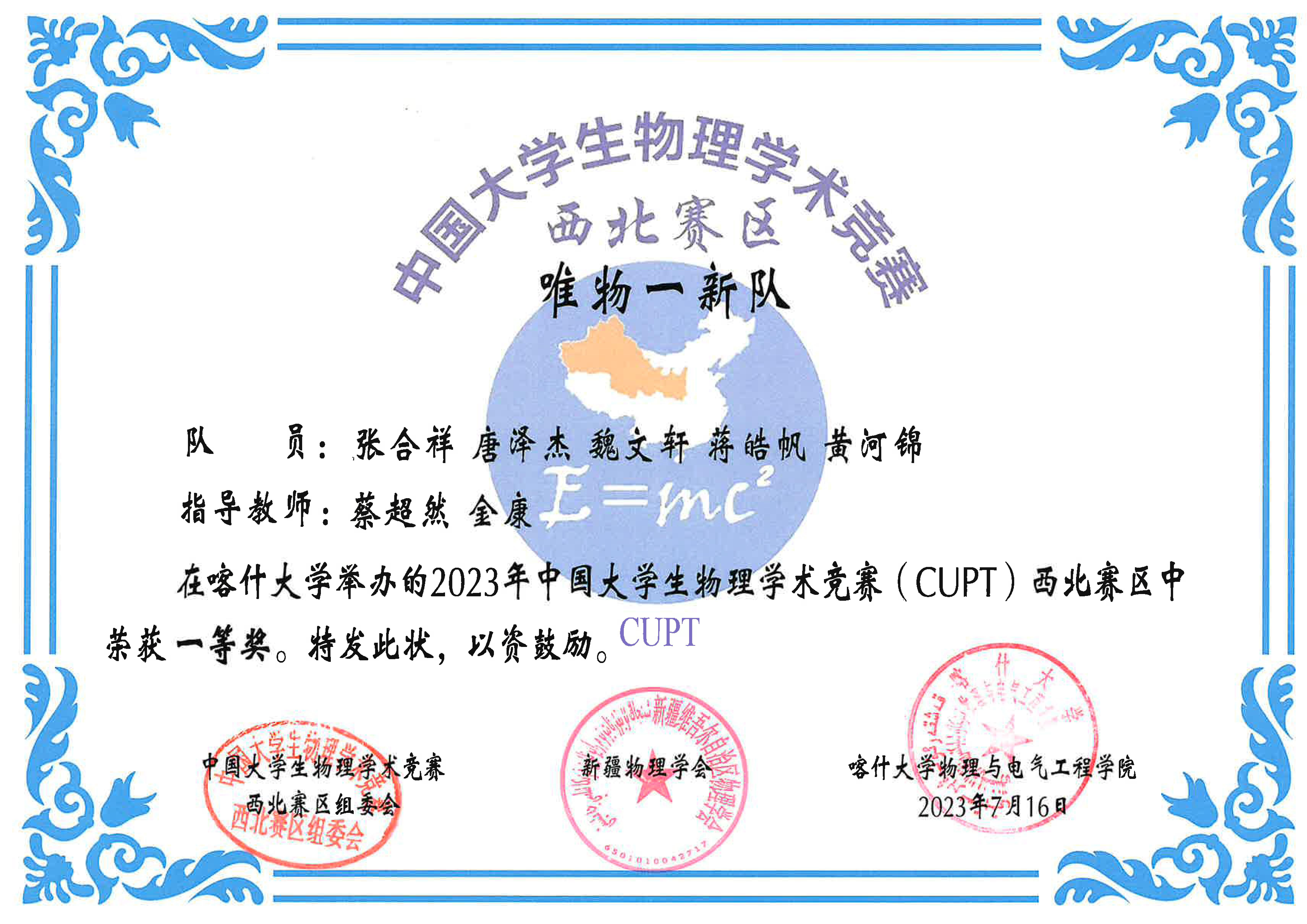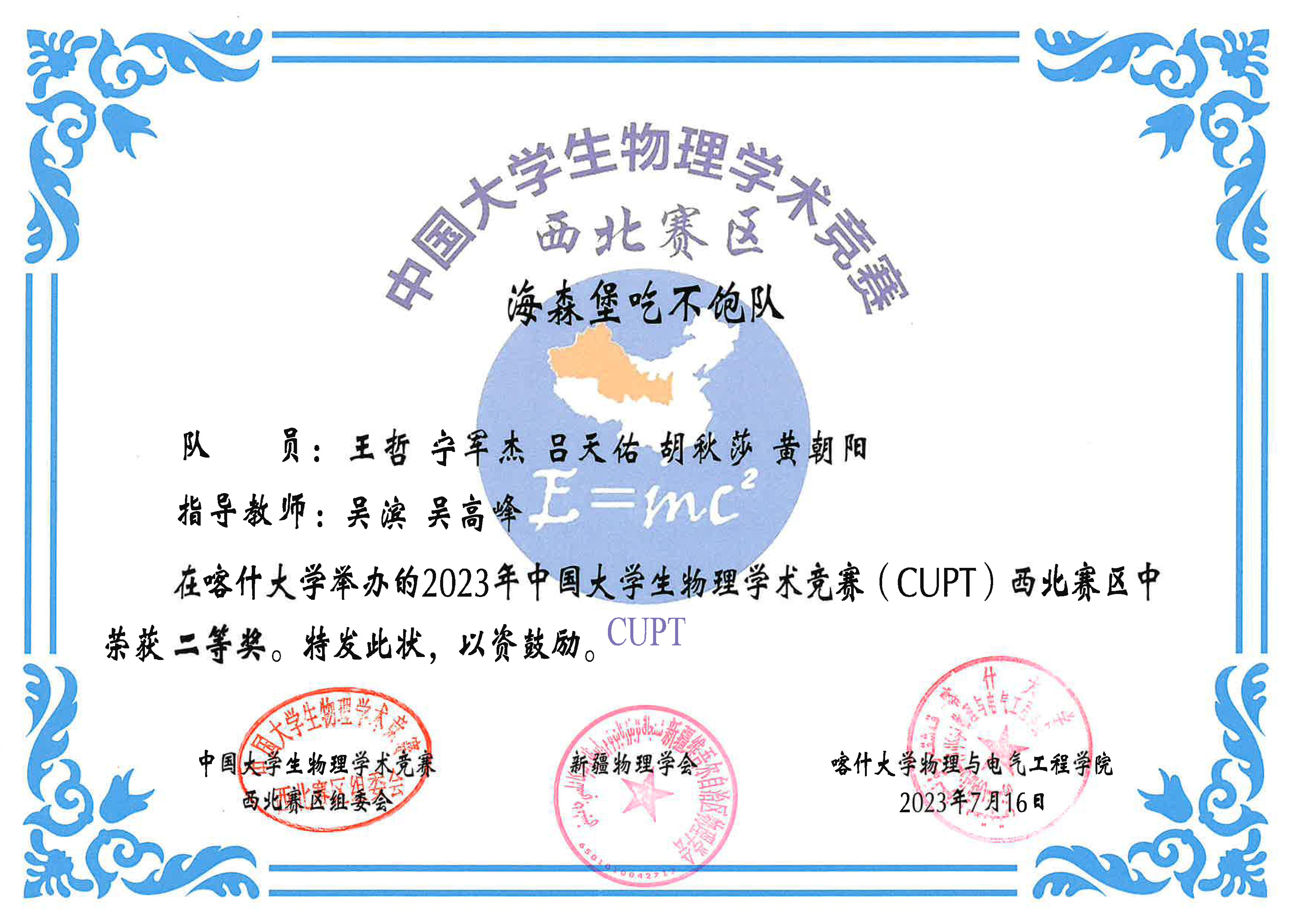 中国大学生物理学术竞赛(CUPT)是中国借鉴国际青年物理学家锦标赛(IYPT)创办的全国性赛事,被列入中国物理学会物理教学指导委员会的工作计划,是实践国家创新驱动发展战略纲要和国家教育中长期发展规划纲要的重要大学生创新竞赛活动之一。竞赛在7月举办地区赛,8月举办国赛。我们的队伍在全国赛中5人获得全国三等奖(一项),地区赛中5人获得西北赛区团队一等奖(一项),10人获得西北赛区团队赛二等奖(两项),12人在省赛上斩获团队二等奖(两项),2人获得个人特等奖,5人获得个人一等奖,2人获得个人二等奖。