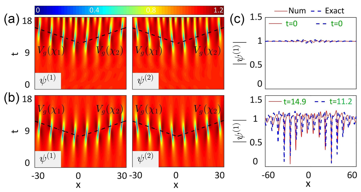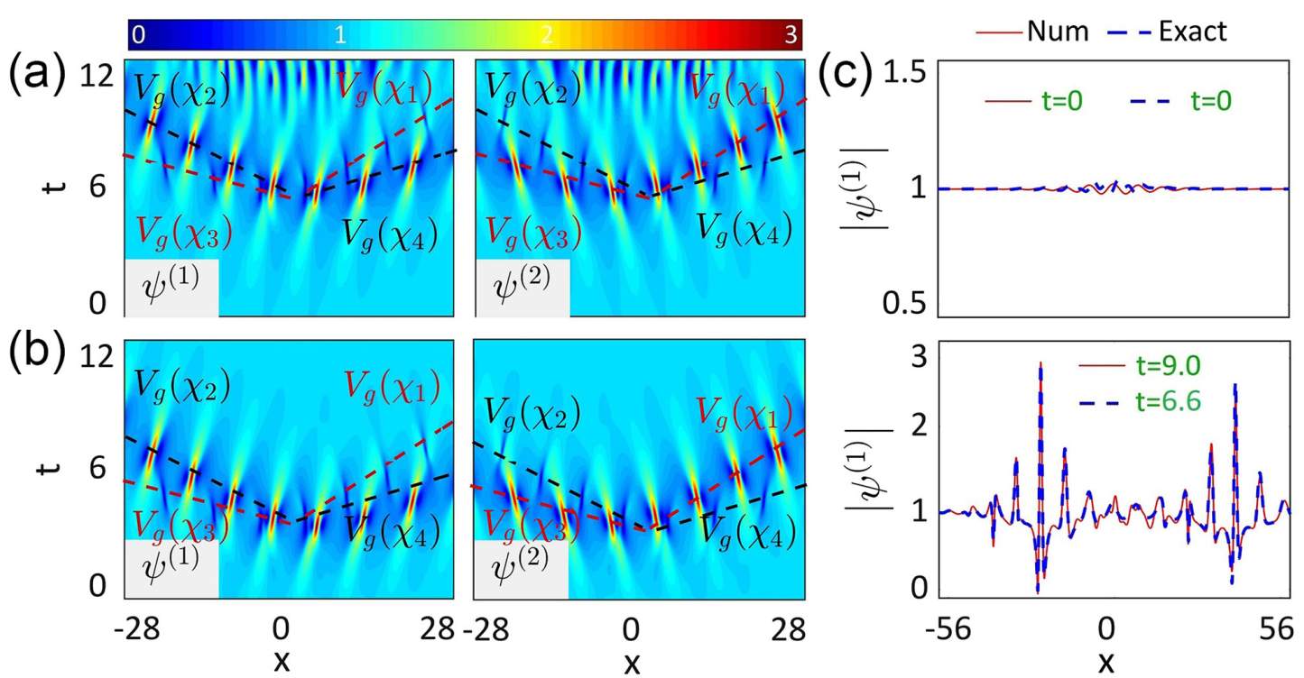 课题组围绕这一难题,基于实验上可实现的矢量非线性可积模型(Manakov方程),利用前期发现的精确对应关系以及最新发展的本征值分析方法[Chin. Phys. Lett. 39, 094201 (2022); Physica D 433, 133192 (2022)],构造了矢量超正则呼吸子严格解[Phys. Rev. Lett. 132,027201 (2024)]。基于这类严格解,预言了新的矢量非线性激发。研究进一步表明该理论可覆盖经典的标量结果。至此,课题组建立了研究超正则呼吸子动力学的一般框架。评审专家评价:“该结果开启了矢量非线性动力学理论和实验研究的新分支(initiate a new branch of theoretical and experimental studies dedicated to vector nonlinear dynamics)”“作者给出了学界期待50余年的严格解(Now the authors have presented us with a solution to a problem that, in fact, has been waiting for a solution for 50 years: the authors discovered new states for the vector nonlinear fields)”。