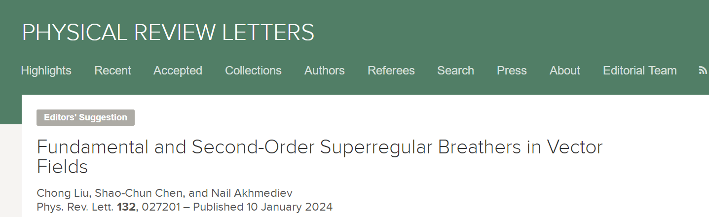 近日,必赢理论物理团队的刘冲副教授课题组在非线性激发的精确理论研究中取得进展,建立了研究超正则(superregular)呼吸子动力学的一般框架,解决了长期困扰非线性物理领域的公开命题。研究成果以“Fundamental and Second-Order Superregular Breathers in Vector Fields”为题,在物理学领域顶级期刊Physical Review Letters上发表,并入选编辑推荐亮点论文(Editors’Suggestion)。
