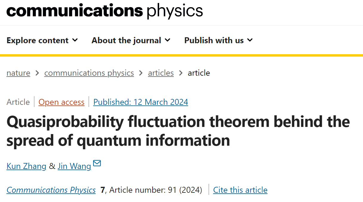 近日,必赢理论物理团队张堃副教授与美国纽约州立大学石溪分校汪劲教授合作,在量子信息动力学研究中取得进展,首次建立了量子信息演化的涨落定理描述,揭示了量子信息演化中的分布规律,并在IBM量子计算机上进行了模拟实验。研究成果以“Quasiprobability fluctuation theorem behind the spread of quantum information”为题,发表在国际著名物理刊物Nature系列期刊《通讯物理》 (Communications Physics 7, 91 (2024))。366net必赢官网为第一研究单位,张堃为该论文的第一作者,汪劲教授为通讯作者。