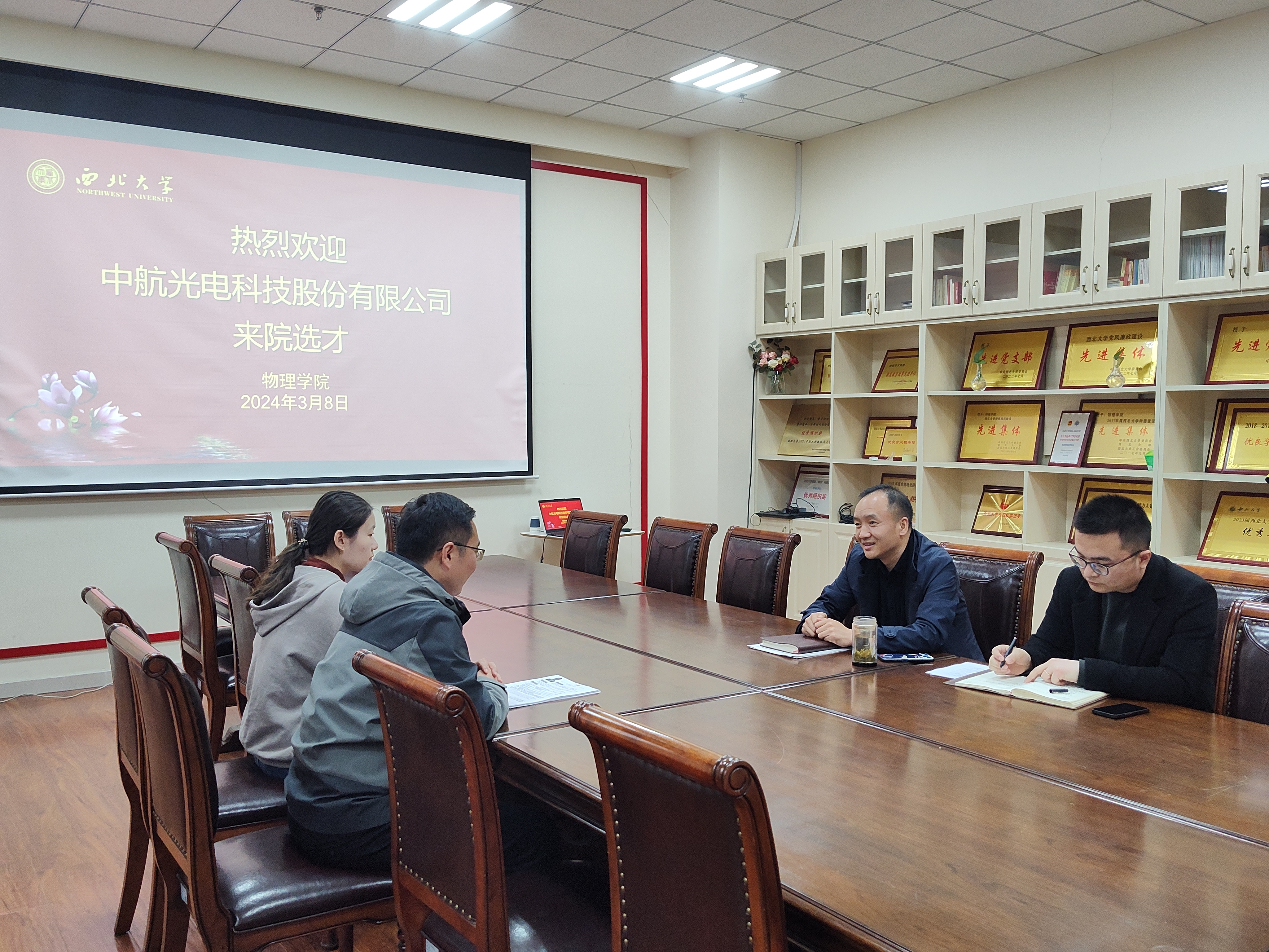 王刚对学院为本次专场招聘会的顺利举办所做的充分准备表示感谢,他着重介绍了公司发展情况,中航光电科技股份有限公司隶属于中国航空工业集团,是专业为航空及防务和高端制造提供互连解决方案的高科技企业,和物理学科有着高度的契合性。他表示,愿意加强校企合作交流,为学生提供良好的实习实践教学平台,充分发挥双方资源优势,共同构建产教融合长效机制。