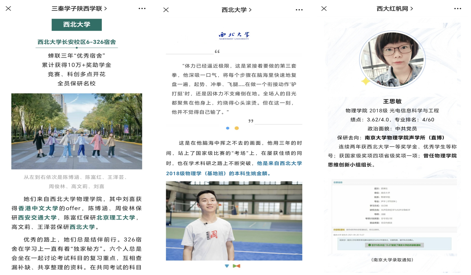 2.立足学科特点,助力学生成才。围绕青年学生关注的学业和发展问题,依托“思创小组”开展学业帮扶等活动、组织各类学科竞赛、成立课外科研训练小组等。三年来本科生获奖项国家级65项、省部级267项,申报国创25项、省创76项,发表论文54篇,本科生宿舍集体保研、省级优秀毕业生潜行科研等先进事迹被中国青年报、中国大学生网等国省校级以上媒体转载报道24篇。