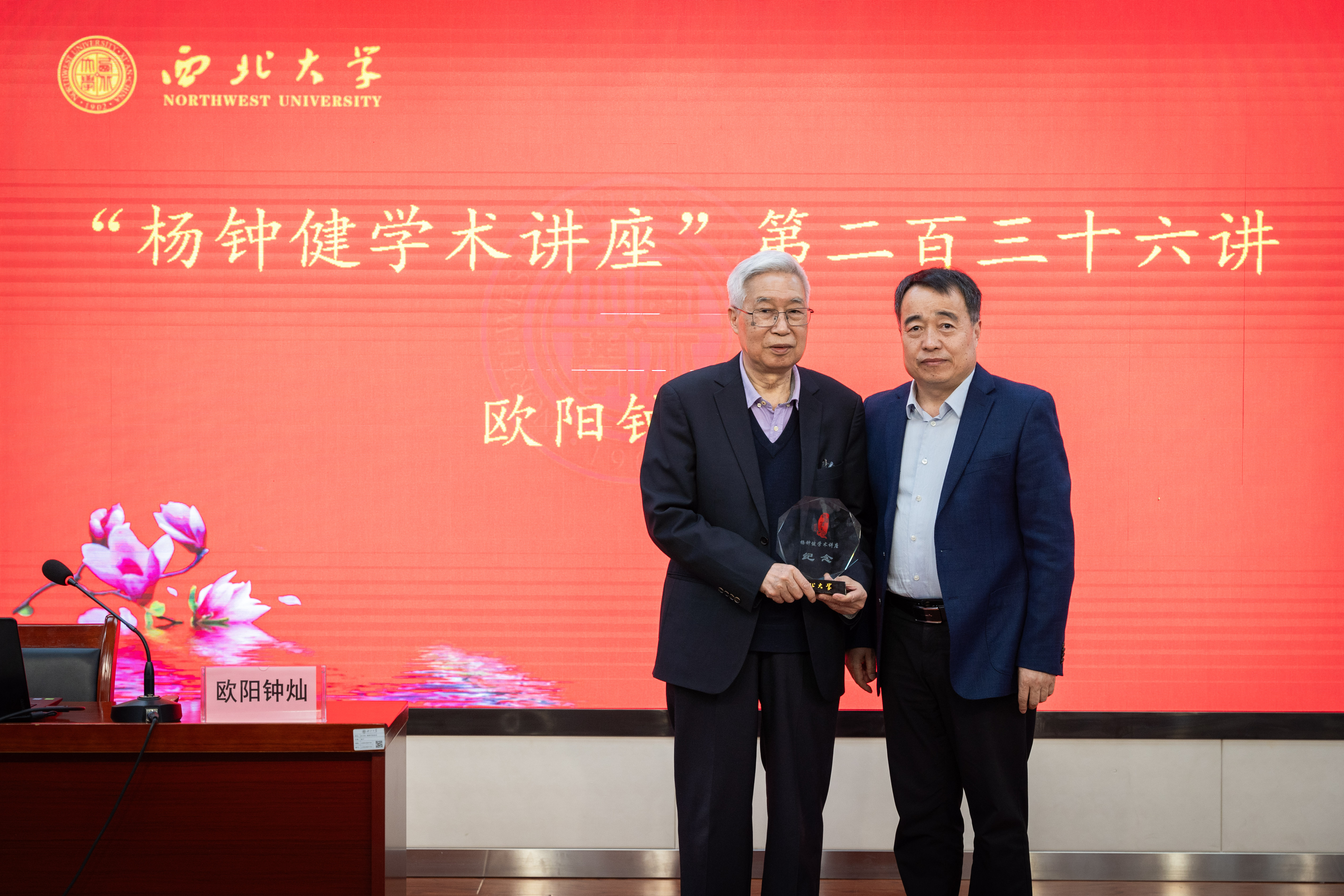 党委常委、副校长李振海代表学校向欧阳钟灿院士赠送“杨钟健学术讲座”纪念牌