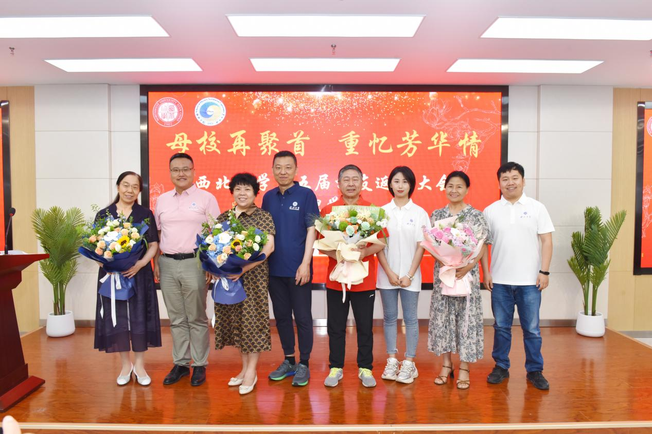 一束束鲜花代表着校友对母校、对老师的敬意与感恩。在温馨的音乐声中,退休教师代表张纪岳、何冠生、马致考、董庆彦、田来科、贺庆丽、吴鹏、罗惠霞、王引弟上台接受校友献花,校友代表捧上鲜花,与敬爱的老师合影留念。